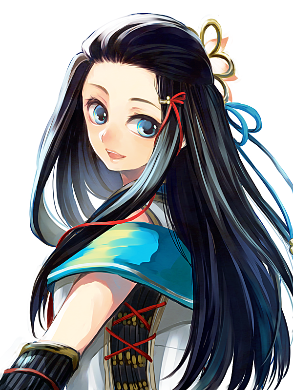 black_hair blue_eyes hair_ribbon lady_hayakawa_(sengoku_musou) japanese_clothes kimono lips long_bangs long_hair parted_bangs ribbon sengoku_musou smile