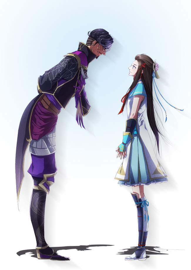 arms_behind_back black_hair blue_eyes brown_hair coat facial_hair goatee hair_ribbon high_collar japanese_clothes kimono lady_hayakawa_(sengoku_musou) leaning_forward lips long_bangs long_hair matsunaga_hisahide_(sengoku_musou) multicolored_hair parted_bangs ribbon sengoku_musou smile socks two-tone_hair white_hair white_socks