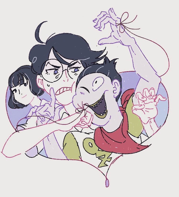 1girl 2boys a85_decap0da ahoge akashi_(yojouhan) annoyed black_eyes black_hair black_ribbon bob_cut cheek_poking closed_mouth colored_skin commentary glasses index_finger_raised looking_at_another male_focus multiple_boys one_eye_closed ozu_(yojouhan) poking purple_eyes red_scarf ribbon round_eyewear scarf sharp_teeth short_hair short_sleeves simple_background string string_of_fate sweat teeth upper_body watashi_(yojouhan) white_background white_skin yojouhan_shinwa_taikei