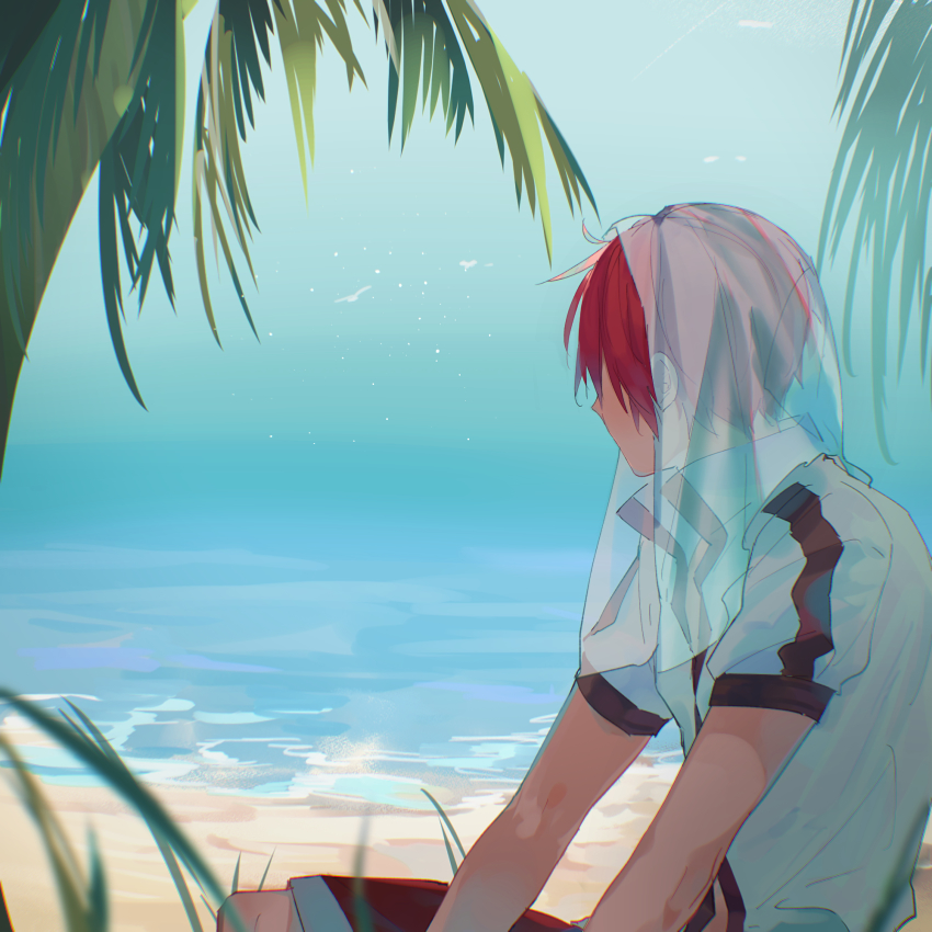 1boy adol_christin day facing_away kiruri_(mimosayoshi) looking_to_the_side male_focus ocean outdoors palm_tree red_hair red_shorts shirt shore short_hair short_sleeves shorts simple_bird solo tree veil white_shirt ys