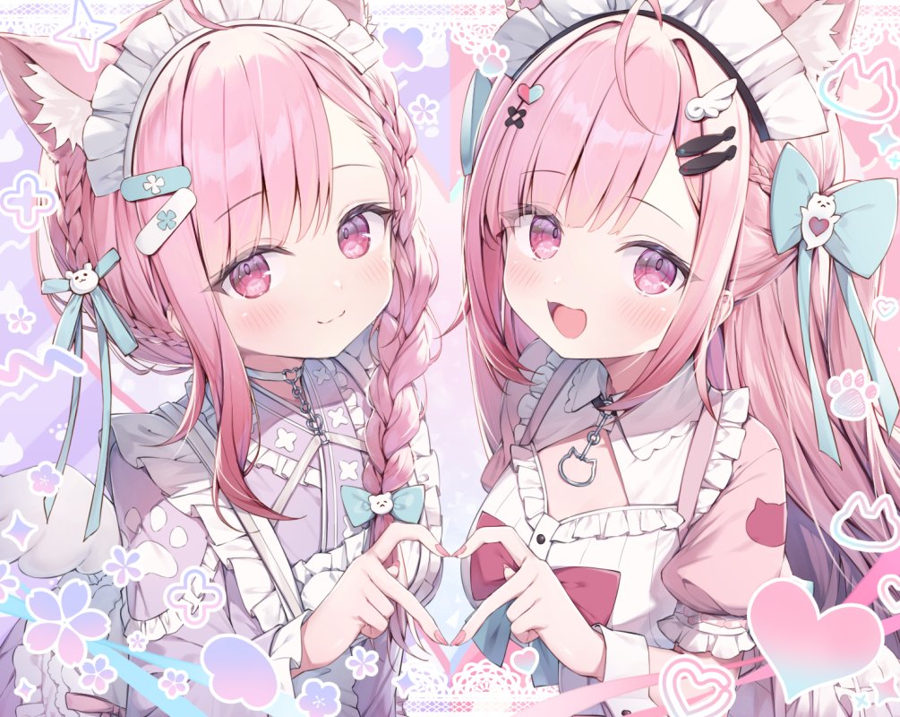 2girls :d animal_ears apron bandaid bandaid_hair_ornament blue_bow blue_ribbon blush bow braid cat_ears choker closed_mouth commentary_request dress dual_persona extra_ears frilled_apron frilled_sleeves frills hair_bow hair_ornament hair_ribbon heart heart_hands heart_hands_duo indie_virtual_youtuber japanese_clothes kimono long_hair long_sleeves looking_at_viewer maid_headdress multiple_girls open_mouth parted_bangs pink_dress pink_eyes pink_hair purple_kimono ribbon short_sleeves single_braid smile topia upper_body virtual_youtuber white_apron white_choker wing_hair_ornament yuuki_sakuna_(1st_costume) yuuki_sakuna_(2nd_costume)