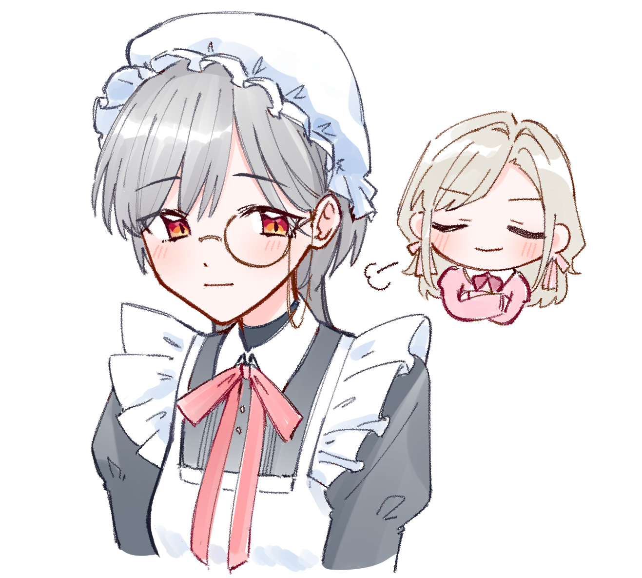 2girls alternate_costume apron blush ceras_yanagida_lilienfeld chibi chibi_inset closed_eyes closed_mouth collared_dress collared_shirt commentary contrast_collar cropped_torso crossed_arms dress edel_note enmaided frilled_apron frilled_hat frills grey_hair hair_intakes hair_ribbon hat juliet_sleeves katsuragi_izumi light_smile link!_like!_love_live! long_hair long_sleeves love_live! maid maid_apron mob_cap monocle monocle_chain multiple_girls neck_ribbon orange_eyes pink_ribbon pink_shirt puff_of_air puffy_sleeves red_ribbon ribbon semi-rimless_eyewear shirt smile swept_bangs untranslatable_commentary turtleneck u_u under-rim_eyewear upper_body v-shaped_eyebrows virtual_youtuber white_apron white_hat wolf_cut zangemiya