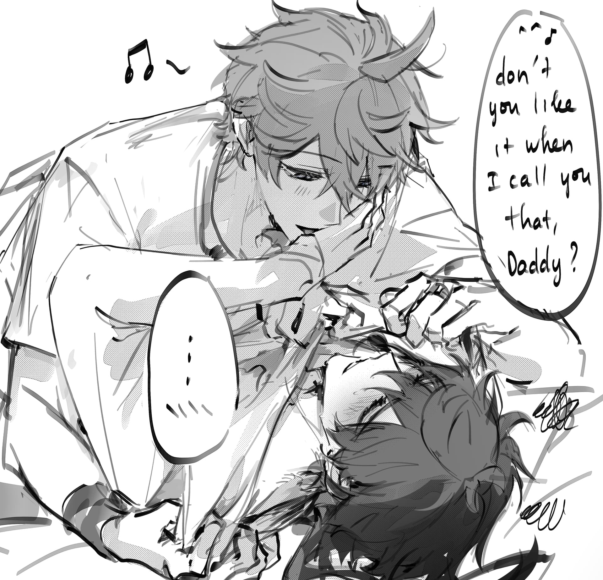 2boys blush english_text genshin_impact greyscale hamtaru542899 highres licking licking_hand monochrome mors_gn multiple_boys musical_note pinned_down speech_bubble tartaglia_(genshin_impact) tartali.club tongue white_background yaoi zhongli_(genshin_impact)