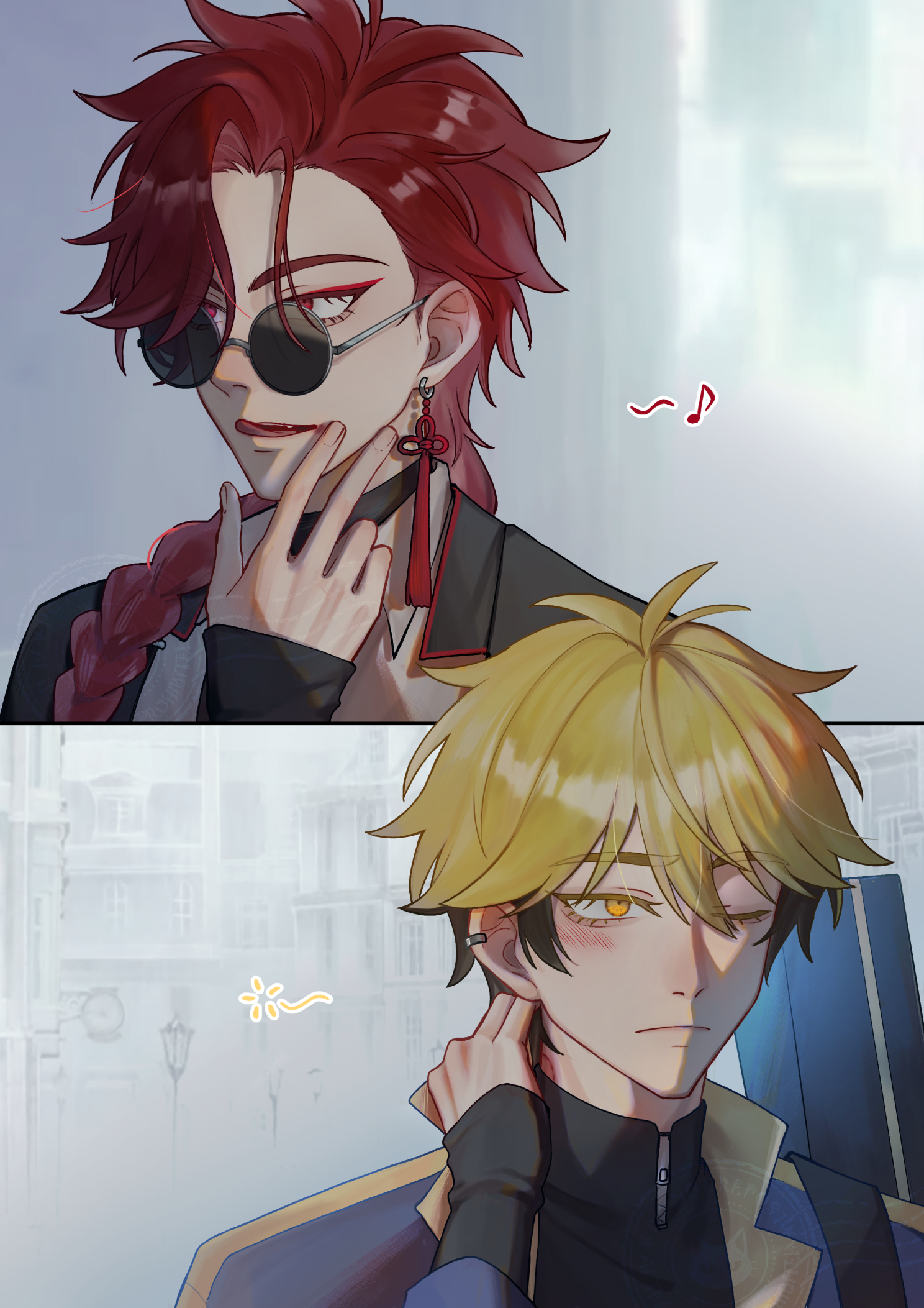 2boys antenna_hair black_hair black_jacket black_shirt blonde_hair blood blood_on_face blue_jacket blush braid braided_ponytail chinese_commentary chinese_knot closed_mouth collared_shirt ear_piercing earrings eyelashes hand_on_own_face hand_on_own_neck hand_up highres instrument_case jacket jacket_on_shoulders jewelry long_hair long_sleeves looking_to_the_side male_focus multicolored_hair multiple_boys musical_note one_eye_closed passing-employee piercing red_eyes red_hair round_eyewear shiguang_dailiren shirt short_hair single_braid single_earring sleeves_past_wrists smile sunglasses tassel tassel_earrings tongue tongue_out turtleneck white_shirt wiping_blood xia_fei xiao_weiying yaoi yellow_eyes zipper