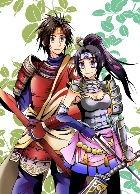 armor black_hair bow_(weapon) breasts brown_eyes brown_hair cleavage hasuhiko headband ina_(sengoku_musou) japanese_clothes miniskirt pantyhose parted_bangs polearm ponytail purple_eyes sanada_yukimura_(sengoku_musou) sengoku_musou skirt smile spear weapon
