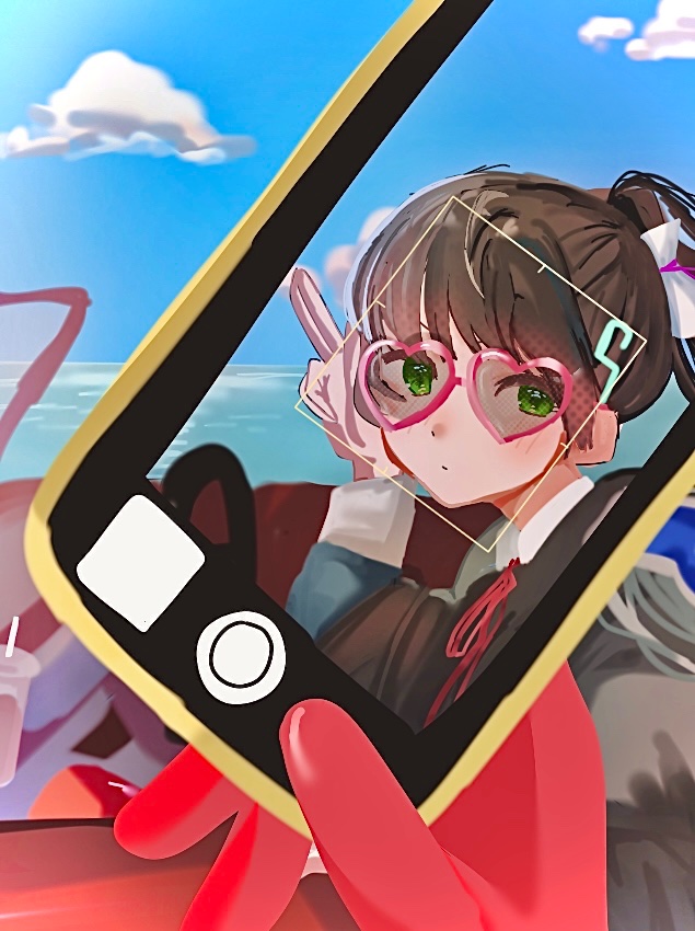 2girls black_hair blue_sky blunt_bangs car convertible female_pov fgscgwoyja32310 gloves green_eyes heaven_burns_red kurosawa_maki long_hair motor_vehicle multiple_girls natsume_inori neck_ribbon phone ponytail pov red_gloves ribbon sky viewfinder