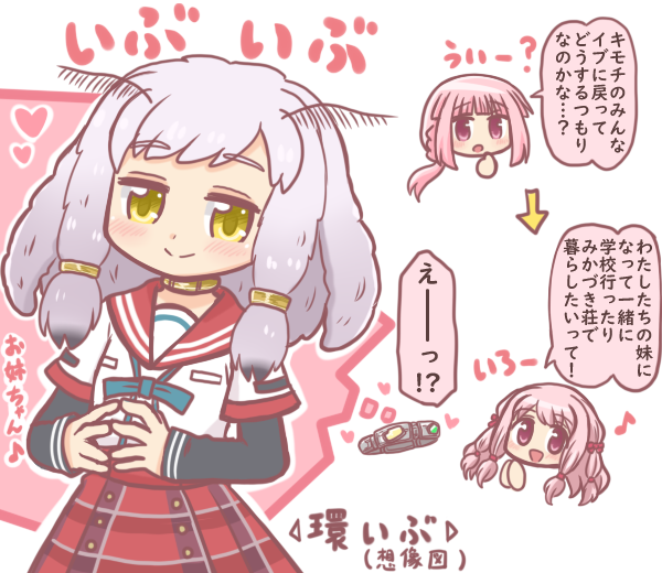 3girls :d antennae arrow_(symbol) bad_id bad_twitter_id blush bracelet breast_pocket character_name chibi dot_nose grey_hair heart jewelry kimochi_(madoka_magica) layered_sleeves long_hair long_sleeves looking_at_viewer magia_record:_mahou_shoujo_madoka_magica_gaiden mahou_shoujo_madoka_magica multiple_girls neck_ribbon open_mouth personification pink_eyes pink_hair plaid_clothes plaid_skirt pocket red_sailor_collar red_skirt reverse_(bluefencer) ribbon sailor_collar school_uniform serafuku shirt shitori_egumo_(madoka_magica) short_over_long_sleeves short_sleeves sidelocks skirt smile speech_bubble tamaki_iroha tamaki_ui thought_bubble white_shirt yellow_eyes