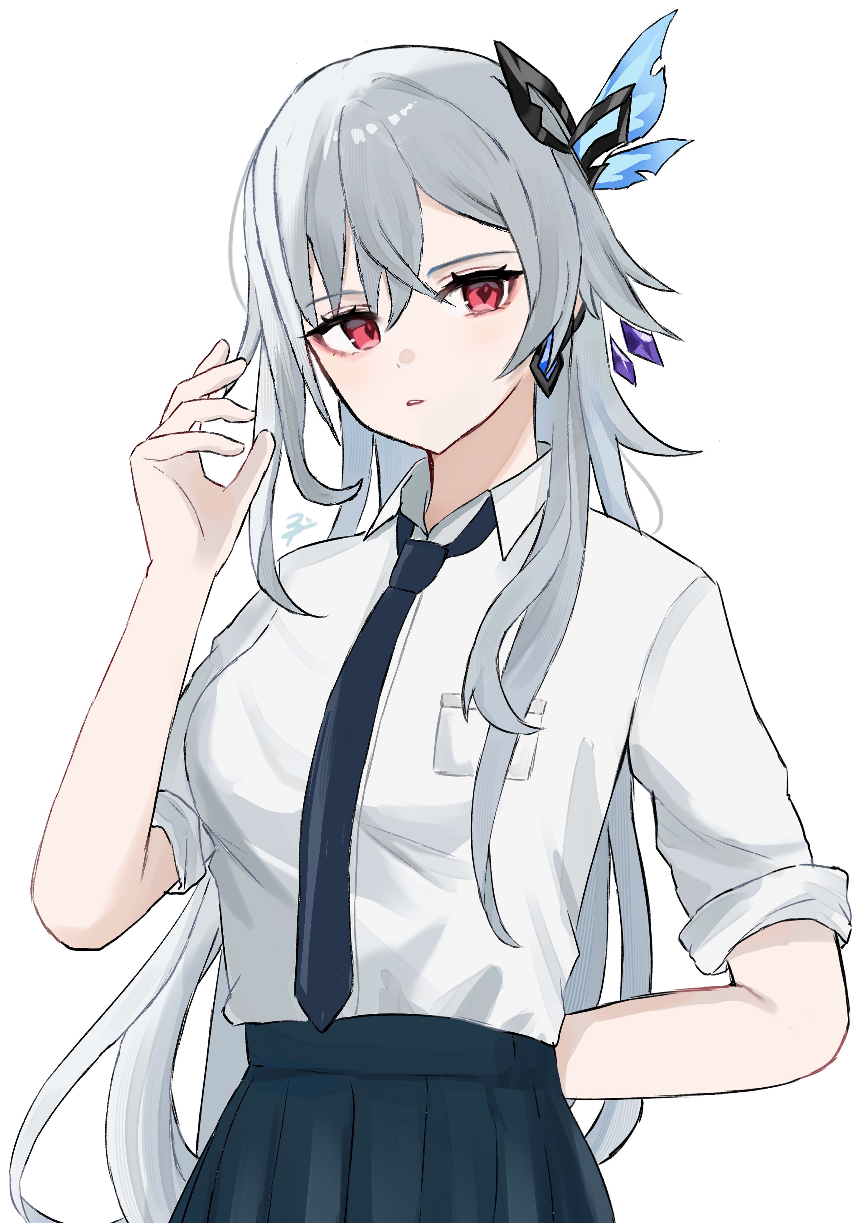 1girl absurdres alternate_costume arm_behind_back black_necktie black_skirt butterfly_hair_ornament collared_shirt cowboy_shot genshin_impact hair_ornament highres karua0621 long_hair necktie parted_lips pink_eyes pleated_skirt school_uniform shirt short_sleeves signature simple_background skirk_(genshin_impact) skirt solo white_background white_hair white_shirt