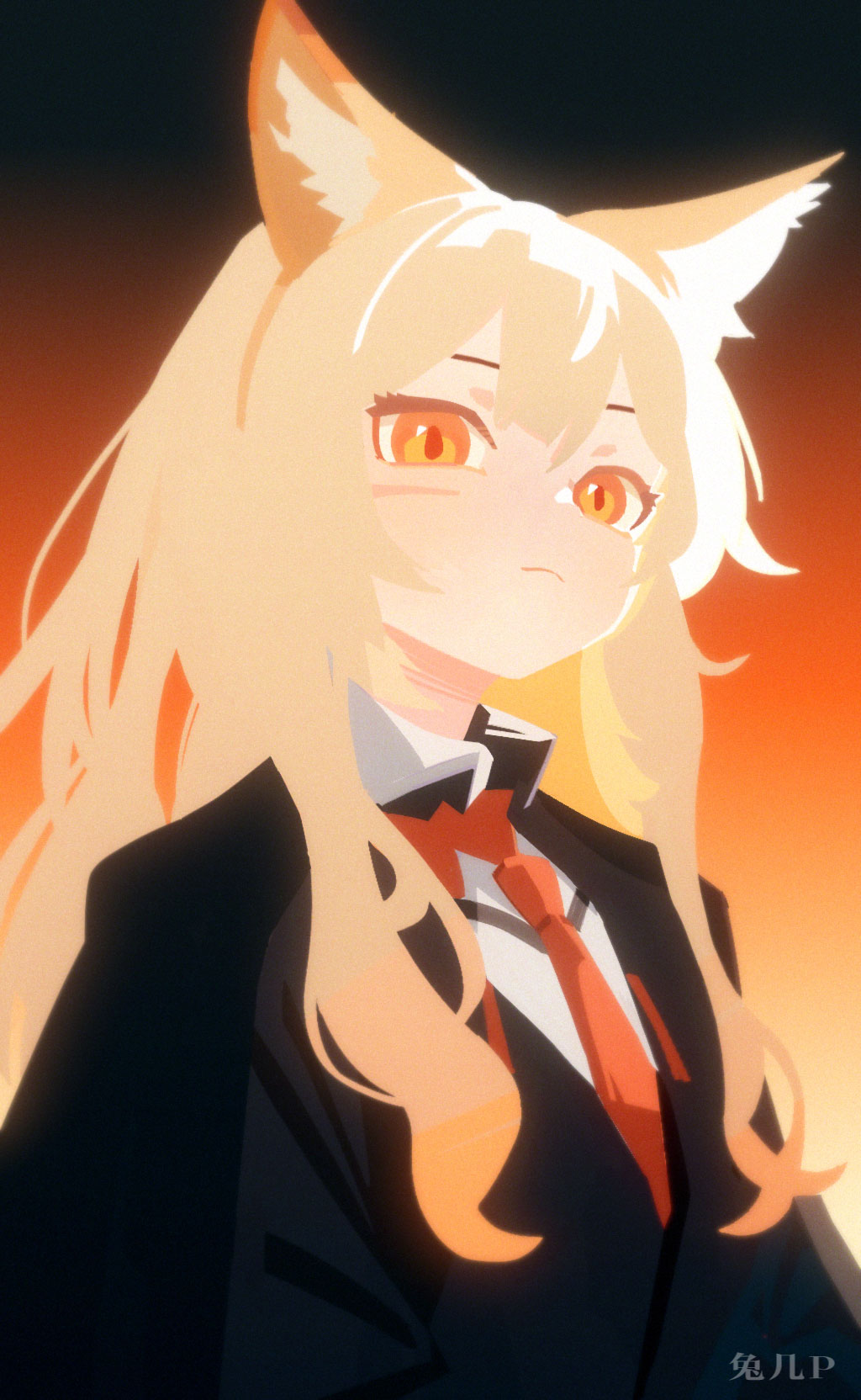 1girl animal_ears arknights black_jacket blonde_hair chinese_commentary closed_mouth commentary_request highres jacket long_hair necktie orange_eyes red_necktie shirt simple_background solo tuji_p upper_body vulpisfoglia_(arknights) white_shirt