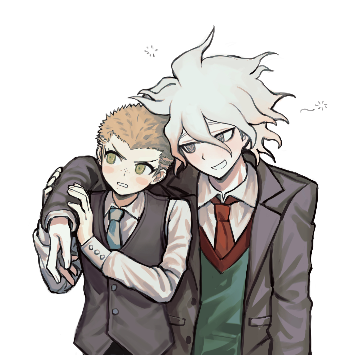 2boys @_@ arm_on_another's_shoulder blonde_hair blush_stickers casssstle12 collared_shirt commentary commentary_request danganronpa_(series) danganronpa_2:_goodbye_despair freckles hand_on_another's_arm highres komaeda_nagito kuzuryu_fuyuhiko looking_at_another male_focus multiple_boys necktie official_alternate_costume school_uniform shirt simple_background smile squeans vest white_background white_hair white_shirt yellow_eyes