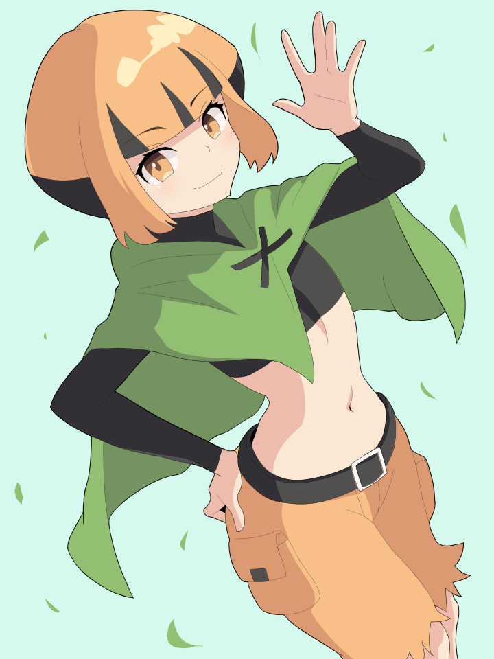 1girl aqua_background black_hair black_shirt brown_eyes brown_hair brown_shorts capelet crop_top gardenia_(pokemon) green_capelet hiyoshipow leaf looking_at_viewer midriff multicolored_hair navel nintendo pokemon pokemon_diamond/pearl/platinum shirt shorts smile solo stomach two-tone_hair