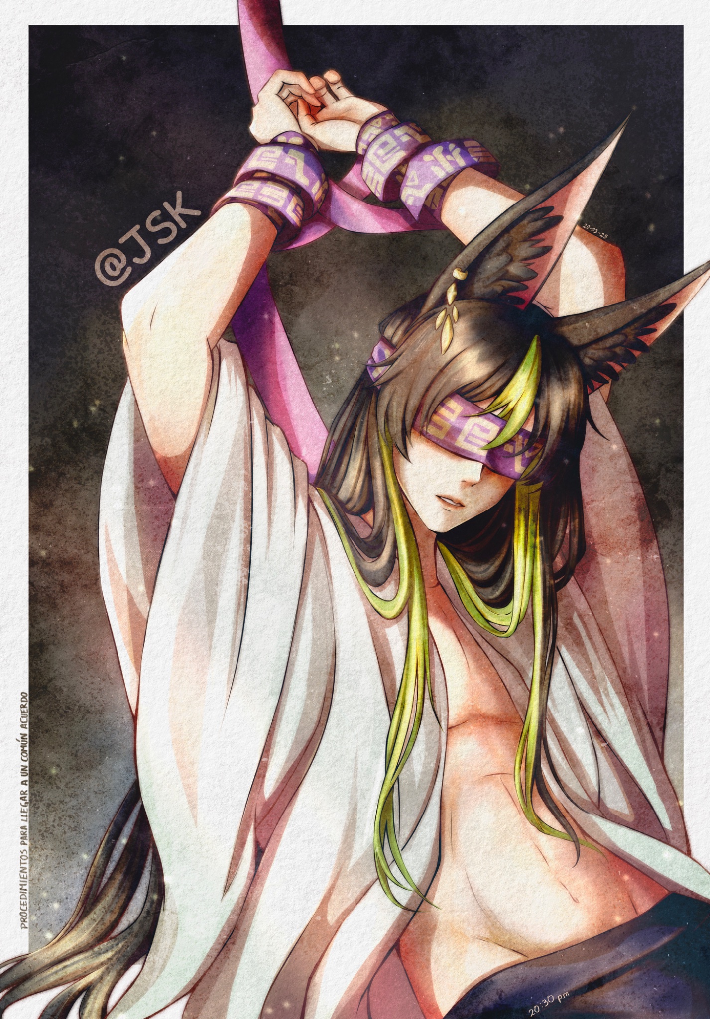 1boy alternate_costume animal_ear_fluff animal_ears black_hair blindfold earrings fox_boy fox_ears genshin_impact green_hair highres jewelry jsk957 long_hair male_focus multicolored_hair open_clothes streaked_hair tighnari_(genshin_impact)