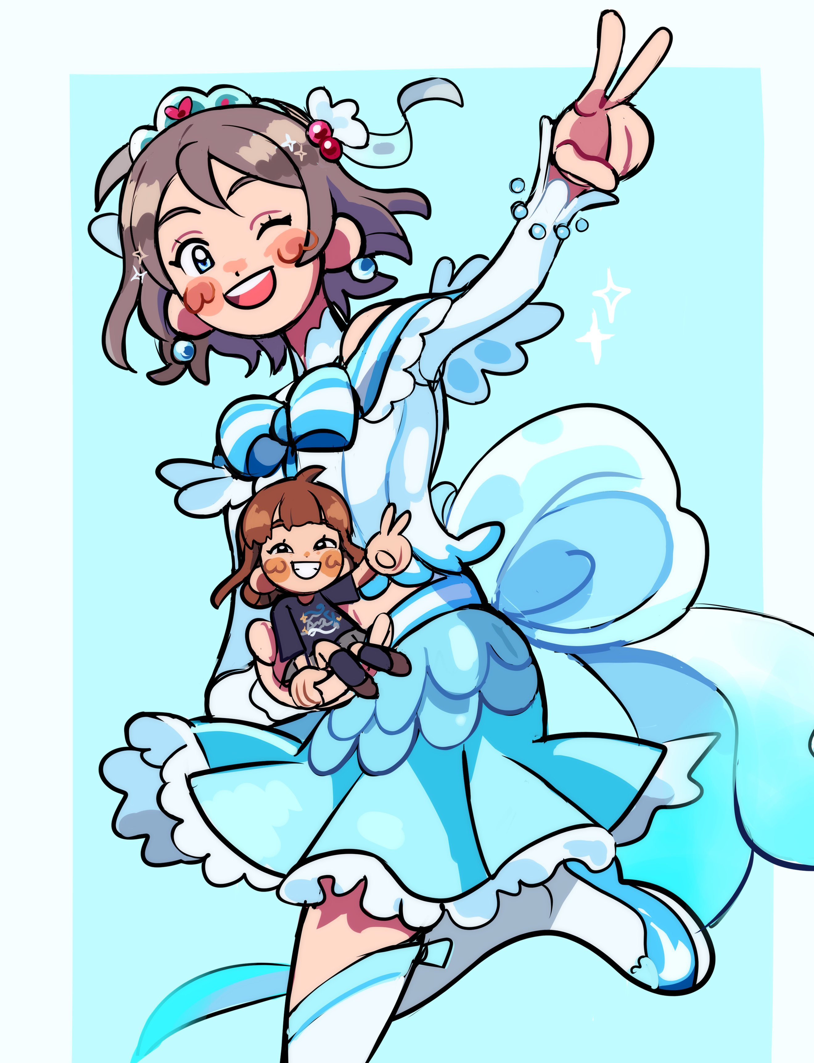 absurdres blue_eyes blush brown_hair chibi grey_hair high_heels highres koi_ni_naritai_aquarium love_live! love_live!_sunshine!! saitou_shuka skirt smile thighhighs watanabe_you