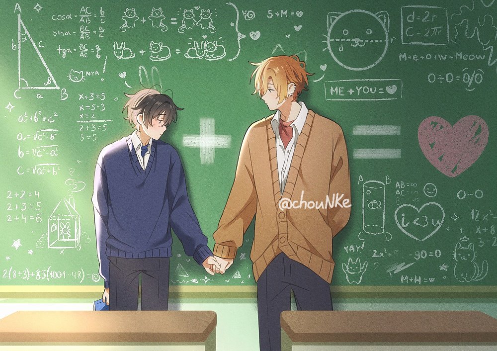 2boys black_hair blue_hood chalkboard chounke desk earrings heart holding holding_hands holding_manga jewelry long_sleeves male_focus manga_(object) miyano_yoshikazu multiple_boys multiple_earrings orange_hair orange_sweater_vest sasaki_shuumei sasaki_to_miyano school_desk school_uniform shirt shirt_partially_removed short_hair sweater_vest white_shirt yaoi
