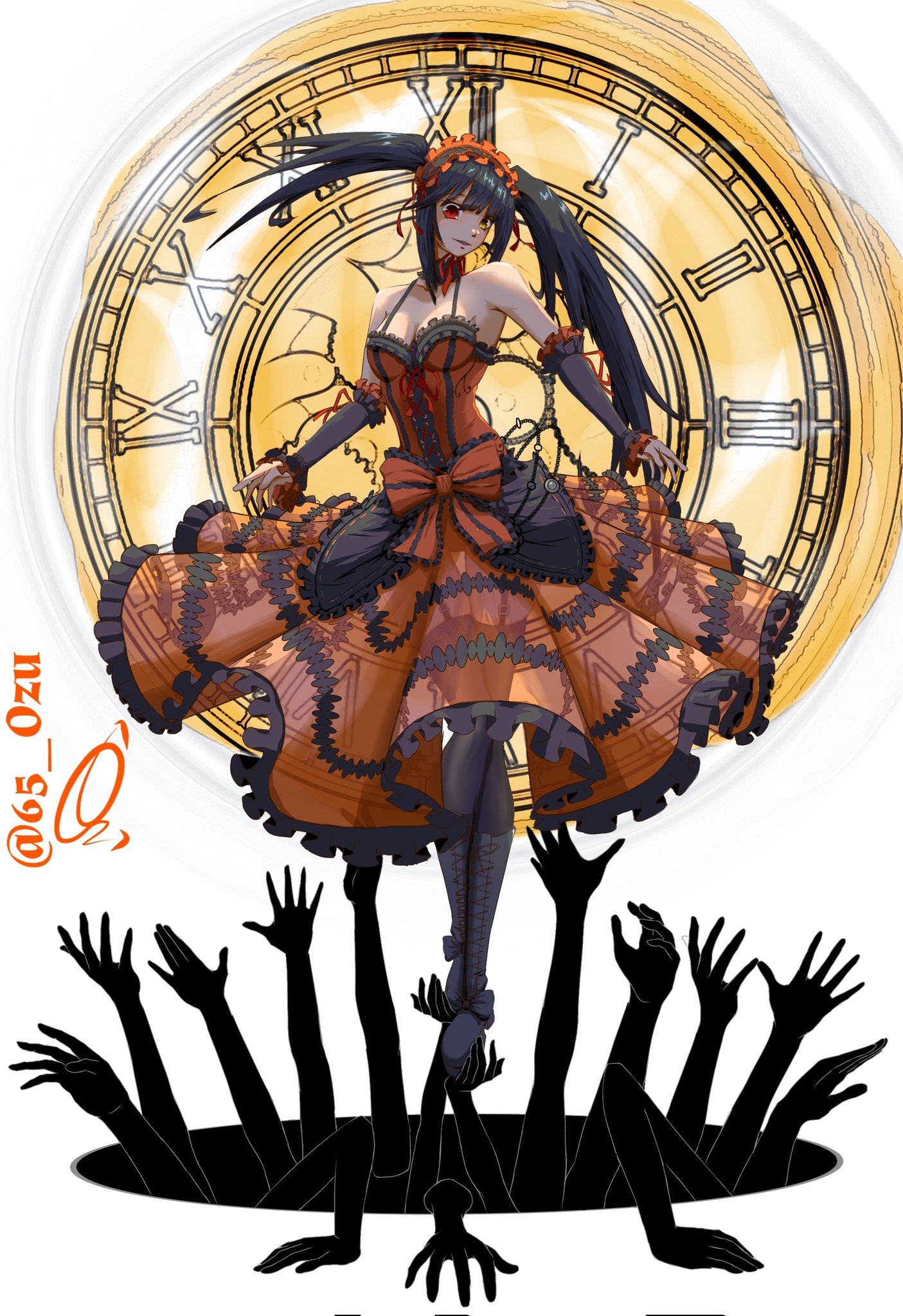 1girl 65ozu black_hair boots breasts cleavage date_a_live dress gothic_lolita highres lolita_fashion red_eyes solo tokisaki_kurumi transparent twintails