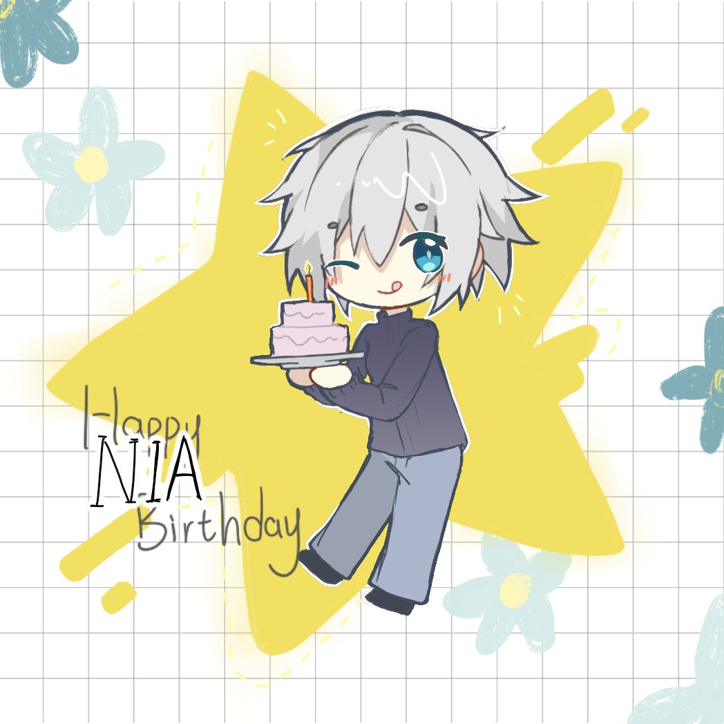 1girl blue_eyes cake chibi date_a_live english_text food honjou_nia n.(pl) one_eye_closed short_hair solo white_hair wink