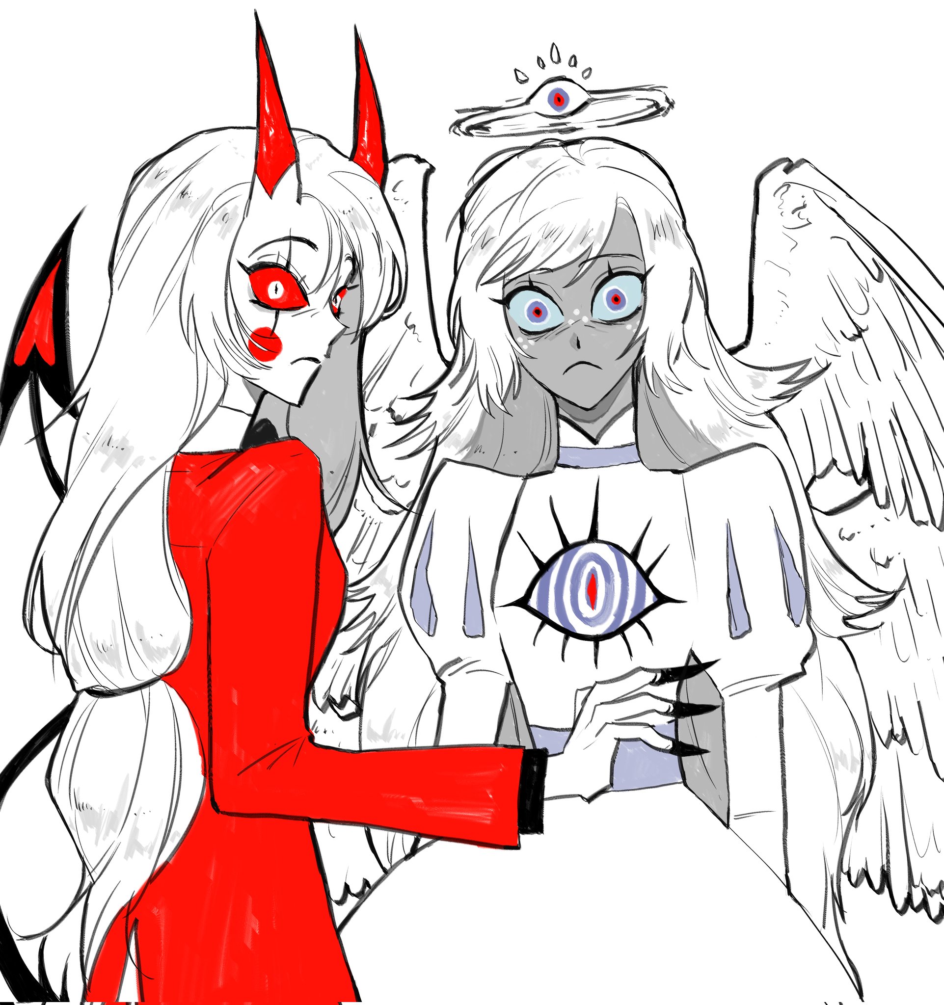2girls angel angel_wings charlie_morningstar dark-skinned_female dark_skin demon_girl demon_horns demon_tail dress emily_(hazbin_hotel) extra_eyes formal_clothes halo hazbin_hotel hellaverse highres horns long_hair multi-tied_hair multiple_girls pink_suit spot_color suit tail tppiiiiqqt very_long_hair white_dress white_hair wings
