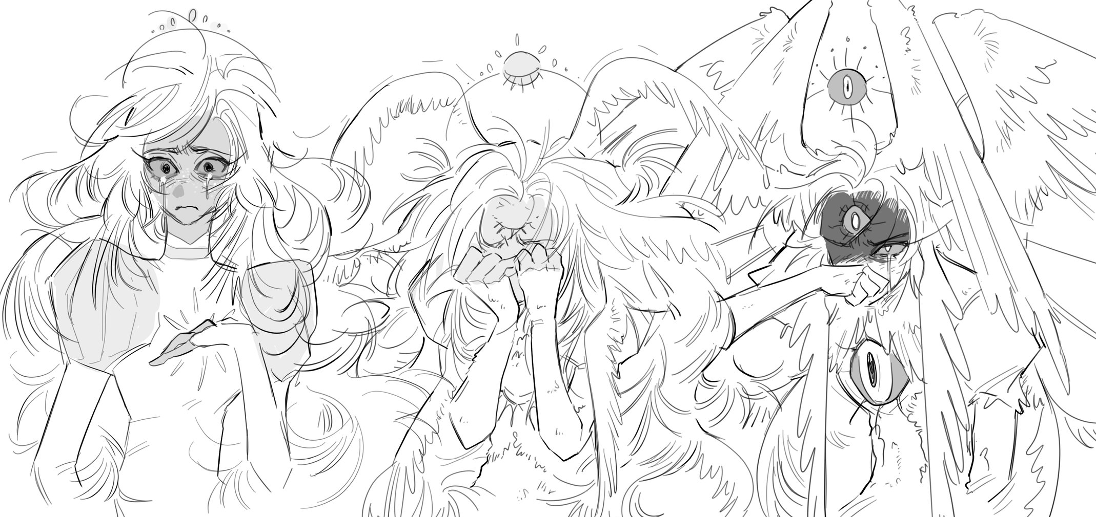 1girl angel_wings angry crying dark-skinned_female dark_skin dress emily_(hazbin_hotel) extra_eyes feathered_wings halo hazbin_hotel head_wings hellaverse highres long_hair solo third_eye_on_chest tppiiiiqqt transformation very_long_hair white_dress white_hair wings