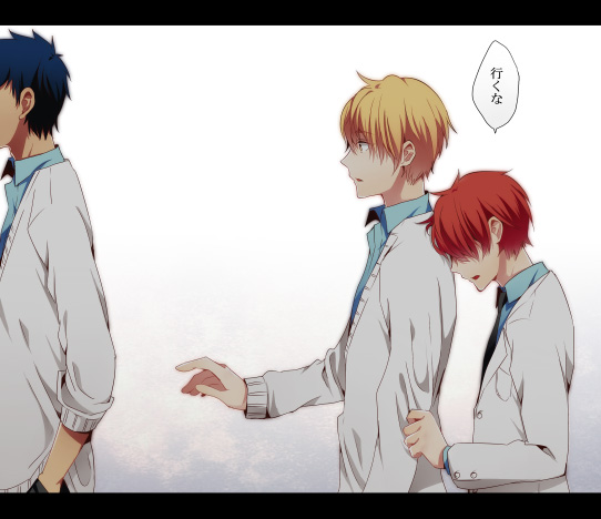 3boys akashi_seijuurou aomine_daiki black_border black_necktie blazer blonde_hair blue_hair blue_shirt border breast_pocket buttons clothes_grab collared_jacket collared_shirt commentary_request dark-skinned_male dark_skin from_side frown hair_between_eyes hair_over_eyes hand_in_pocket jacket kise_ryouta kuroko_no_basuke lapels layered_sleeves letterboxed long_sleeves looking_at_another male_focus multiple_boys necktie notched_lapels open_mouth outstretched_hand parted_lips pocket pointy_nose reaching red_hair ryabu sad shirt short_hair size_difference grabbing_another's_sleeve sleeves_rolled_up speech_bubble surprised sweater_jacket translation_request upper_body walking_away white_background white_jacket wide-eyed yellow_eyes