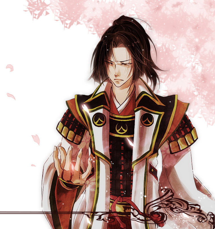 armor black_hair blunt_bangs brown_eyes coat japanese_clothes naoe_kanetsugu_(sengoku_musou) parted_bangs petals ponytail sengoku_musou