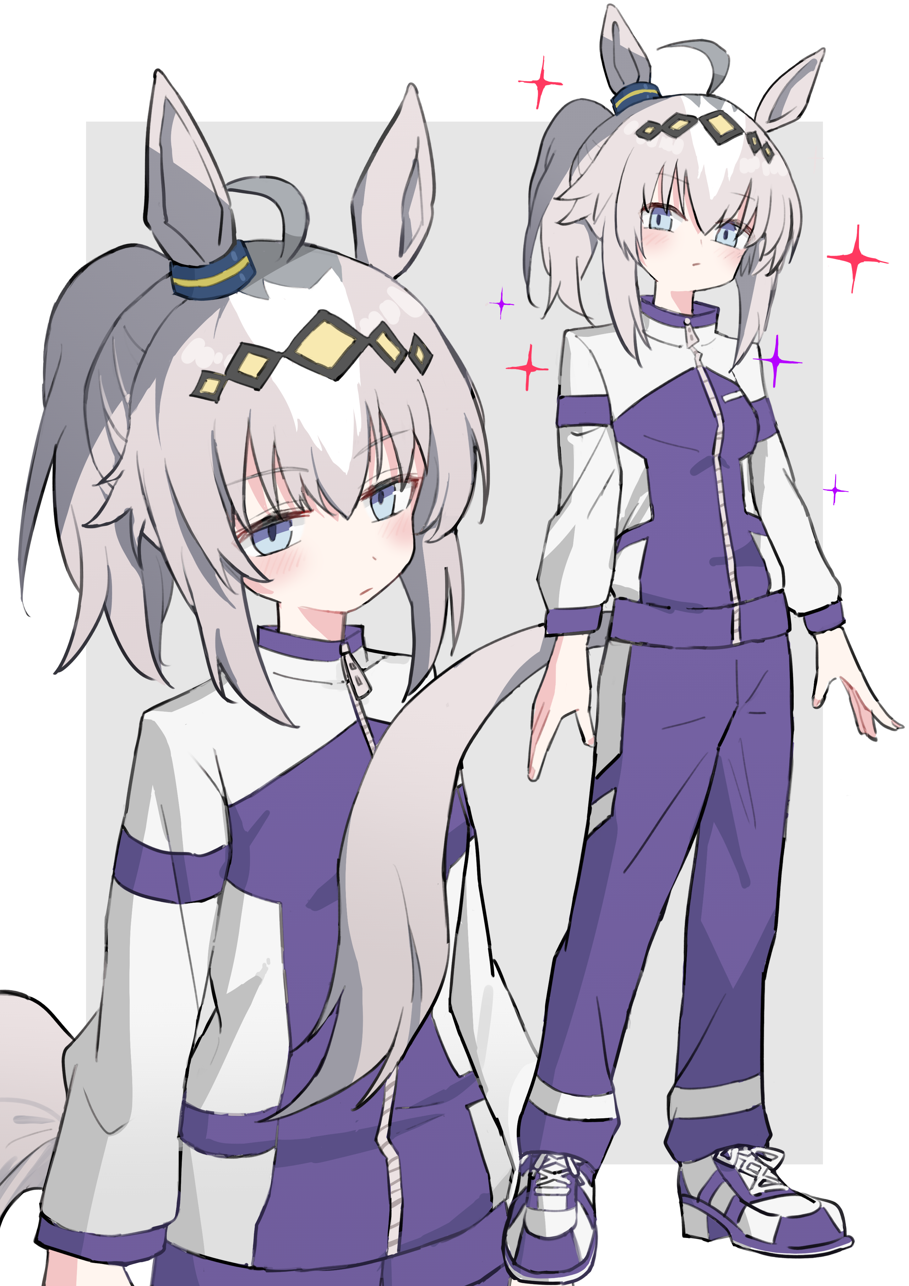 1girl absurdres ahoge amane_ito animal_ears blue_eyes blush border closed_mouth commentary_request full_body grey_background grey_hair hair_ornament highres horse_ears horse_girl horse_tail jacket kasamatsu_tracen_training_uniform long_hair multicolored_hair multicolored_jacket multiple_views oguri_cap_(umamusume) outside_border ponytail purple_jacket purple_track_suit standing star_(symbol) streaked_hair tail track_suit two-tone_jacket umamusume umamusume:_cinderella_gray white_border white_hair white_jacket