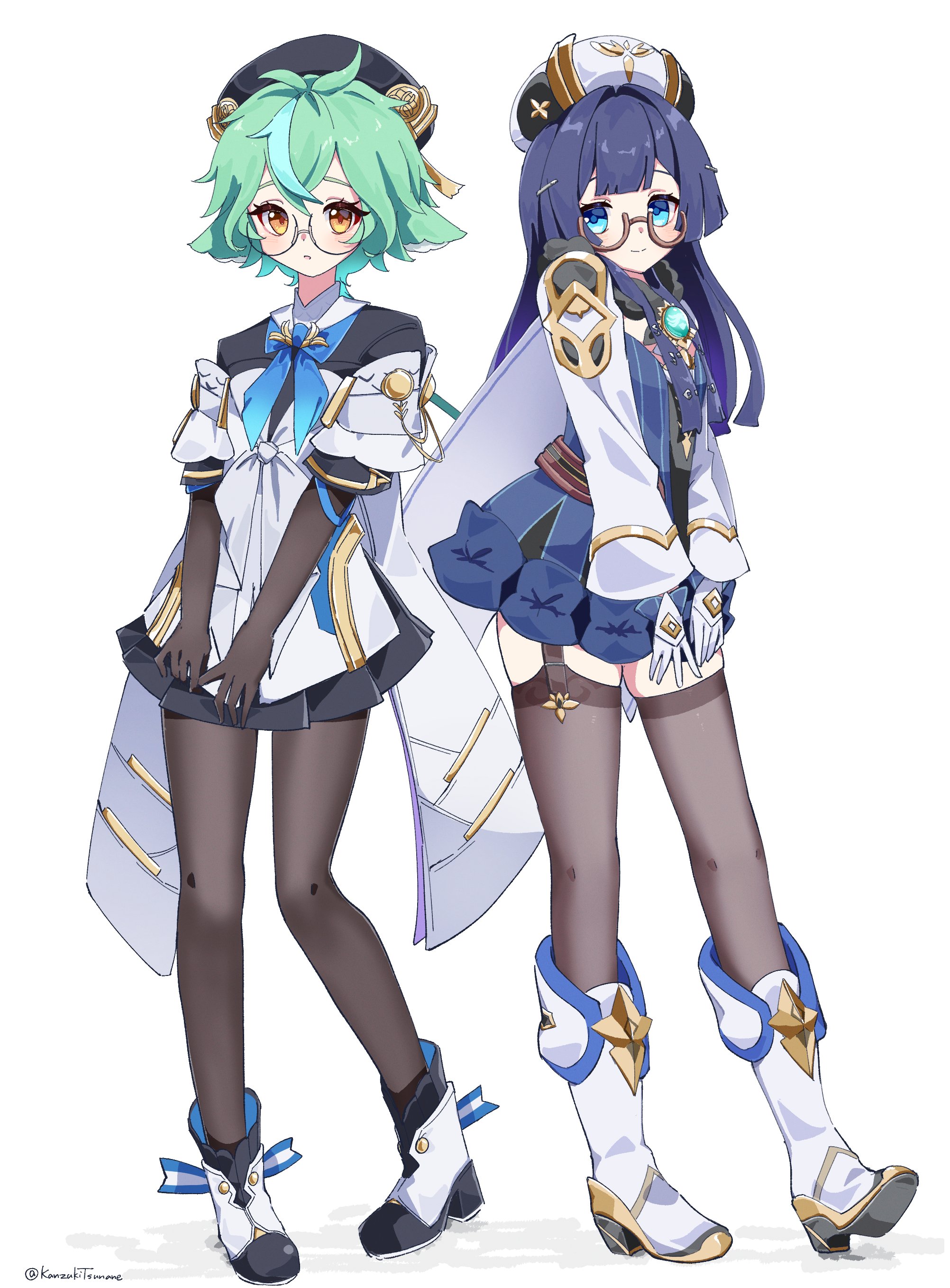 2girls absurdres black_garter_straps black_gloves black_hat black_pantyhose black_thighhighs blue_dress blue_hair closed_mouth commentary_request cosplay costume_switch crossover dress elbow_gloves full_body garter_straps genshin_impact glasses gloves green_hair hat highres honkai:_star_rail honkai_(series) kanzuki_tsunane long_hair long_sleeves looking_at_viewer medium_hair mihoyo multiple_girls pantyhose pela_(honkai:_star_rail) pela_(honkai:_star_rail)_(cosplay) semi-rimless_eyewear shoes short_sleeves smile standing sucrose_(genshin_impact) sucrose_(genshin_impact)_(cosplay) thighhighs twitter_username very_long_hair white_dress white_gloves white_hat white_shoes white_sleeves yellow_eyes zettai_ryouiki