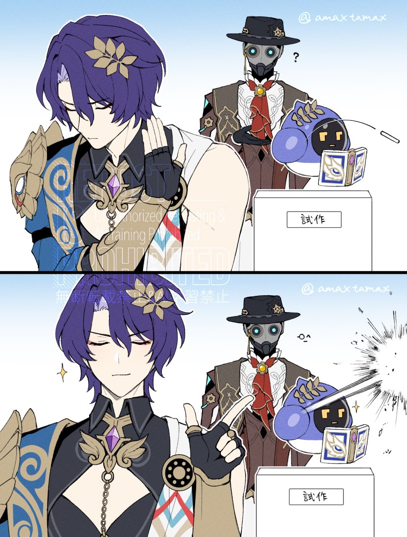 2boys ? amata_(amaxtamax) ancient_greek_clothes aqua_eyes armor artist_name ascot black_gloves black_hat black_shirt blue_background book brooch brown_coat brown_vest chalk cleavage_cutout closed_eyes closed_mouth clothing_cutout coat collared_shirt commentary_request dr._ratio_(honkai:_star_rail) drakeposting_(meme) eyeliner fedora fingerless_gloves gem gloves gradient_background greco-roman_clothes hair_between_eyes hair_ornament hand_up hat honkai:_star_rail honkai_(series) jewelry long_sleeves makeup male_focus meme monocle multiple_boys multiple_views open_book parted_bangs pauldrons purple_gem purple_hair red_ascot red_eyeliner robot screwllum_(honkai:_star_rail) shirt short_hair shoulder_armor single_pauldron sleeveless sleeveless_shirt smile smirk twitter_username u_u upper_body v-shaped_eyebrows vambraces vest watermark white_background wing_collar