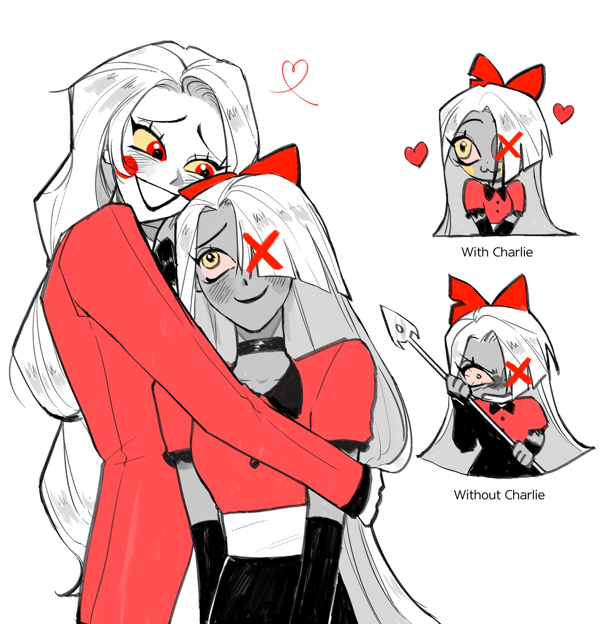 2girls :3 angry blush_stickers charlie_morningstar demon_girl formal_clothes hair_ribbon hazbin_hotel hellaverse highres holding holding_polearm holding_weapon hug long_hair looking_at_another multiple_girls pink_suit polearm ribbon shirt skirt suit tppiiiiqqt vaggie weapon yuri