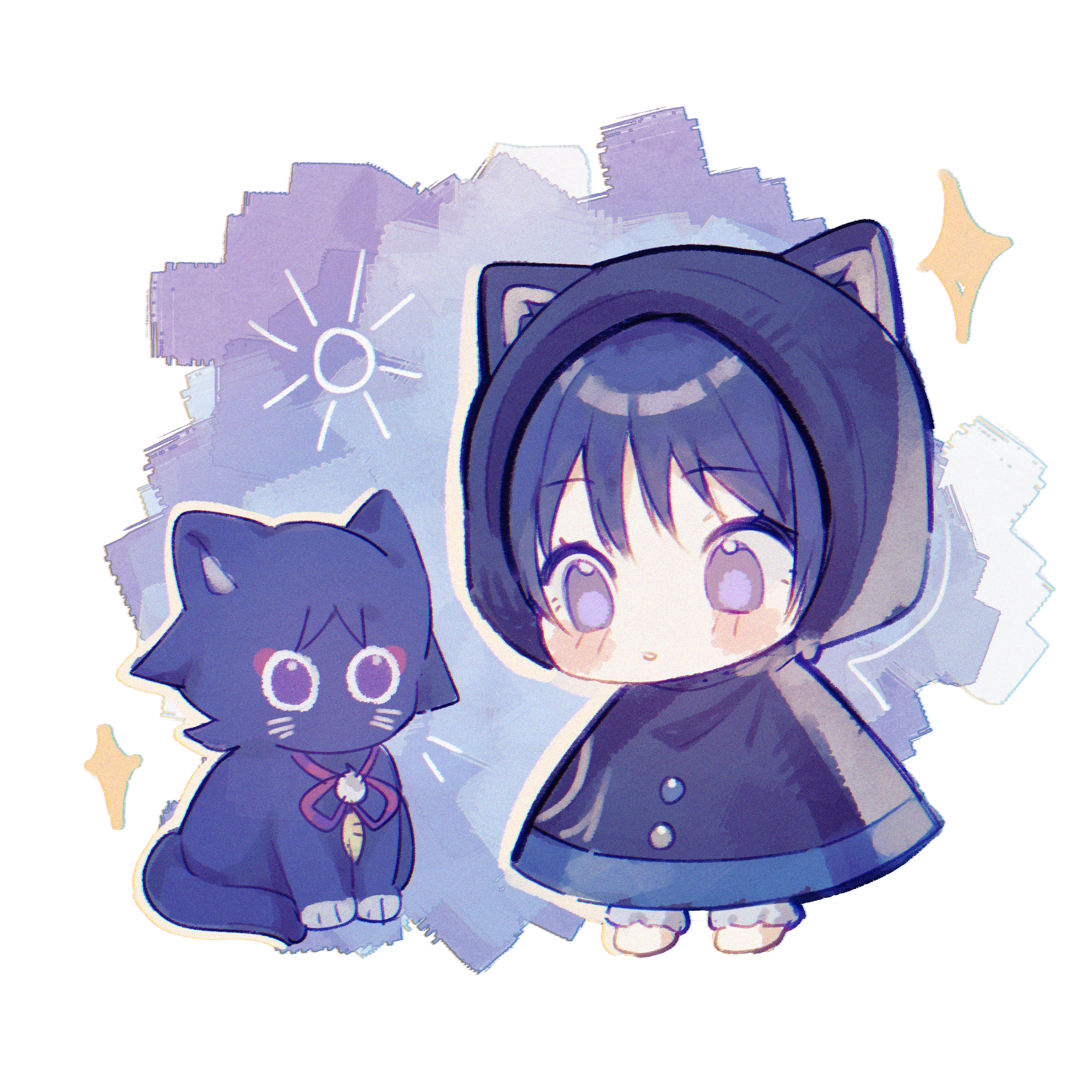 1boy alternate_costume animal_ear_hood animal_ears animalization bloomers blush cat cat_ears chibi choppy_bangs cloak coat fake_animal_ears feathers genshin_impact highres hood hood_up hooded_cloak jairosan looking_at_animal male_focus official_alternate_costume open_mouth person_and_animalization pom_pom_(clothes) purple_cat purple_coat purple_eyes purple_hair purple_hood scaramouche_(cat)_(genshin_impact) scaramouche_(genshin_impact) simple_background standing string tareme underwear wanderer_(genshin_impact) white_bloomers white_mouth white_trim yellow_feathers
