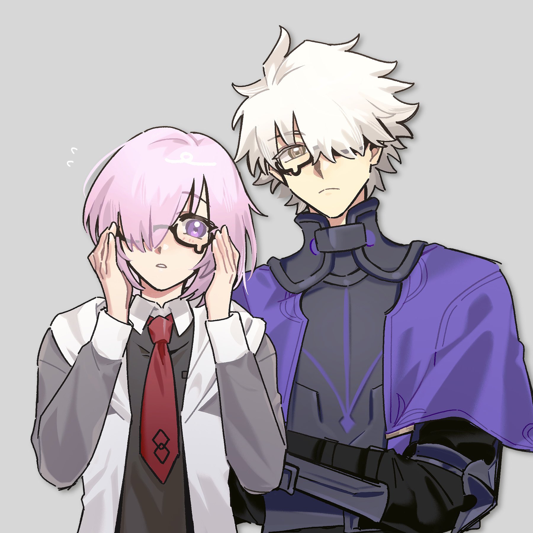 1boy 1girl :o armor black-framed_eyewear black_armor black_dress breastplate capelet closed_mouth collared_dress commentary_request crossed_arms dress fate/grand_order fate_(series) flying_sweatdrops galahad_(fate) glasses grey_background grey_jacket hair_over_one_eye height_difference highres jacket knight lil1dove long_sleeves mash_kyrielight multicolored_jacket necktie one_eye_covered open_clothes open_jacket pink_hair purple_capelet purple_eyes red_necktie short_hair simple_background two-tone_jacket white_hair white_jacket