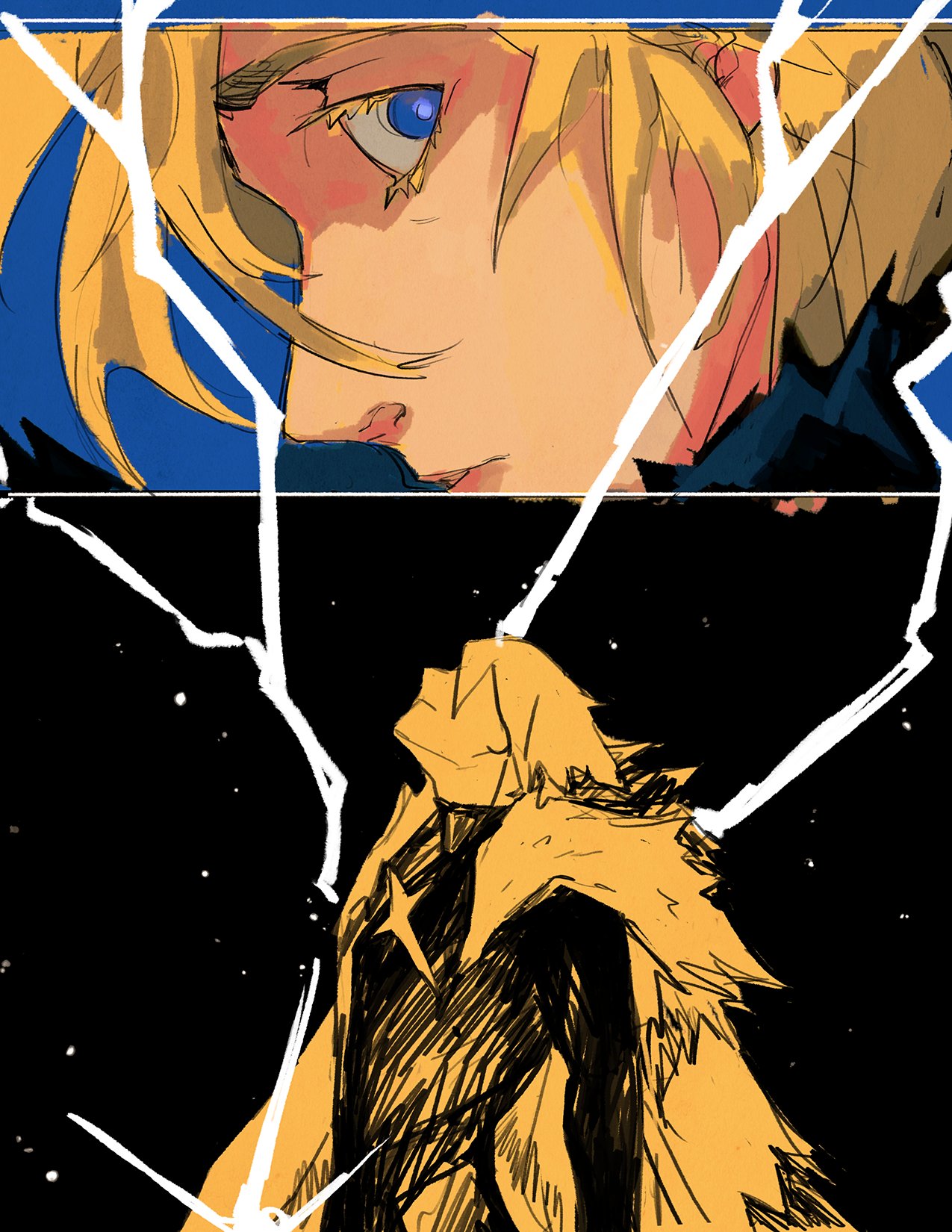 1boy armor black_fur blonde_hair cape closed_mouth colored_eyelashes commentary covered_eyes dimitri_alexandre_blaiddyd dimitri_alexandre_blaiddyd_(timeskip) english_commentary eyelashes fire_emblem fire_emblem:_three_houses fur-trimmed_cape fur_trim head_back highres kairoskairo lightning looking_to_the_side male_focus multiple_views nintendo parted_lips sideways_glance sky star_(sky) starry_sky