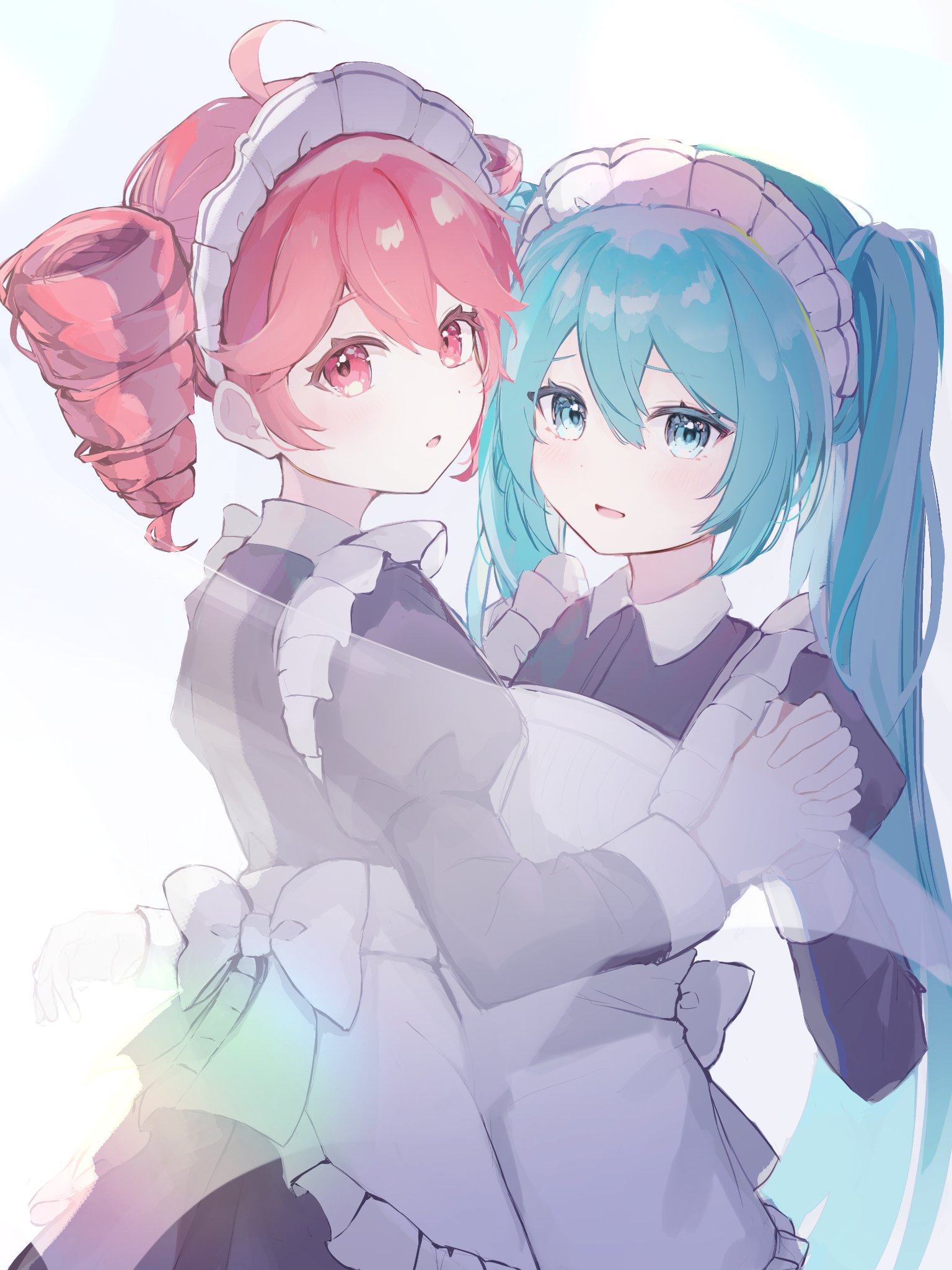 2girls ahoge alternate_costume apron black_dress blue_background blush commentary_request double-parted_bangs dress drill_hair enmaided frilled_apron frilled_hairband frills from_side gloves hair_between_eyes hairband hatsune_miku highres holding_hands interlocked_fingers kasane_teto long_dress long_hair long_sleeves looking_at_viewer maid maid_headdress multiple_girls n_karakure open_mouth red_eyes red_hair twin_drills utau vocaloid white_apron white_gloves white_hairband