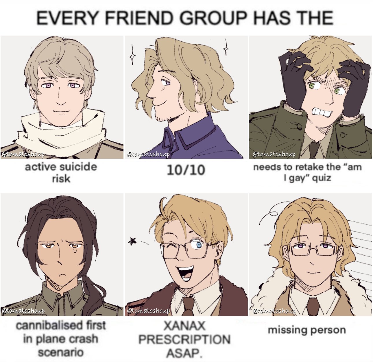 6+boys :< :d ahoge america_(hetalia) asymmetrical_bangs axis_powers_hetalia beard_stubble black_gloves blonde_hair blue_eyes brown_hair brown_jacket brown_necktie canada_(hetalia) china_(hetalia) collared_shirt cuff_links curtained_hair english_text facial_hair france_(hetalia) fur-trimmed_jacket fur_trim glasses gloves green_eyes green_jacket green_necktie grimace hands_on_own_head highres jacket light_smile long_hair long_sleeves looking_at_another looking_at_viewer meme multiple_boys necktie one_eye_closed open_mouth parted_bangs portrait profile purple_eyes raised_eyebrows raised_inner_eyebrows rectangular_eyewear russia_(hetalia) scarf semi-rimless_eyewear shirt short_hair side_ponytail smile straight-on straight_hair stubble swept_bangs tareme thick_eyebrows tomatoshoup twitter_username united_kingdom_(hetalia) v-shaped_eyebrows wavy_hair white_scarf wink_star yellow_eyes