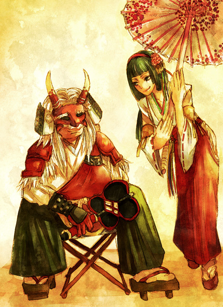 black_eyes black_hair chair detached_sleeves fake_horns folding_chair hairband hakama hand_fan horned_headwear horns japanese_clothes kimono legs lips long_skirt mask miko okuni_(sengoku_musou) parasol platform_sandals sandals sengoku_musou skirt tabi takeda_shingen_(sengoku_musou) umbrella