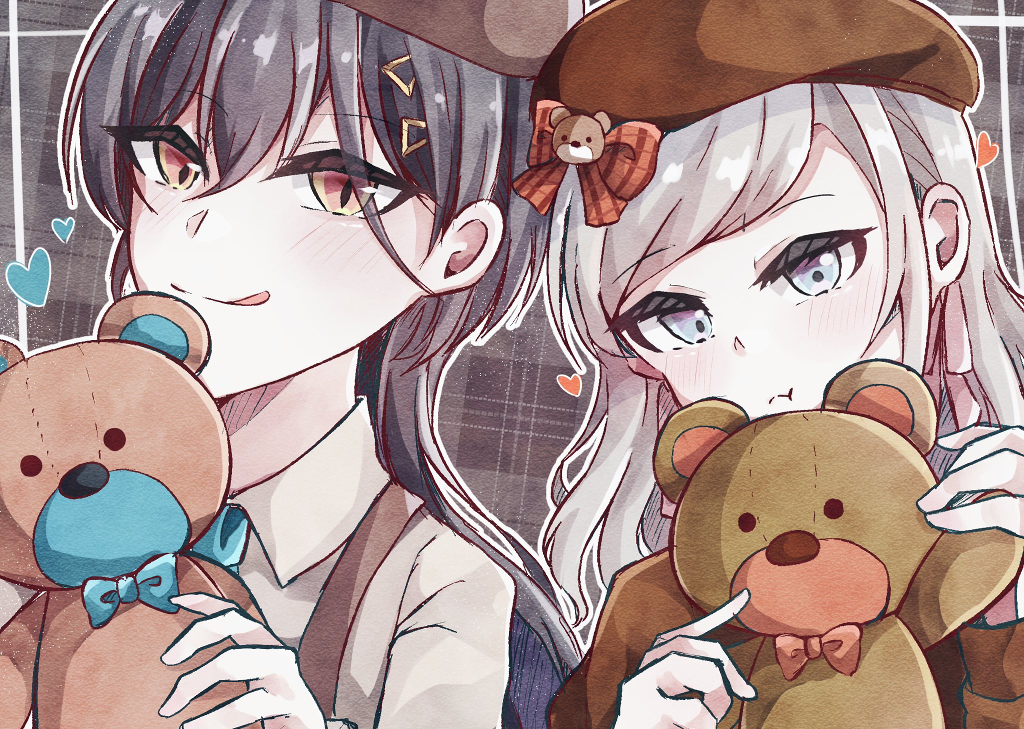 2girls :q :t blue_bow blue_bowtie blue_eyes blush bow bowtie brown_hat ceras_yanagida_lilienfeld ceras_yanagida_lilienfeld_(chara_dolce) collared_shirt commentary edel_note frown grey_background grey_hair grey_shirt hair_between_eyes hair_ornament hat heart highres katsuragi_izumi katsuragi_izumi_(chara_dolce) light_particles link!_like!_love_live! love_live! multiple_girls official_alternate_costume orange_bow orange_bowtie orange_eyes outline plaid_background pout shirt slit_pupils split_mouth stuffed_animal stuffed_toy suspenders untranslatable_commentary teddy_bear tongue tongue_out triangle_hair_ornament tumugi06hana upper_body virtual_youtuber white_outline wolf_cut