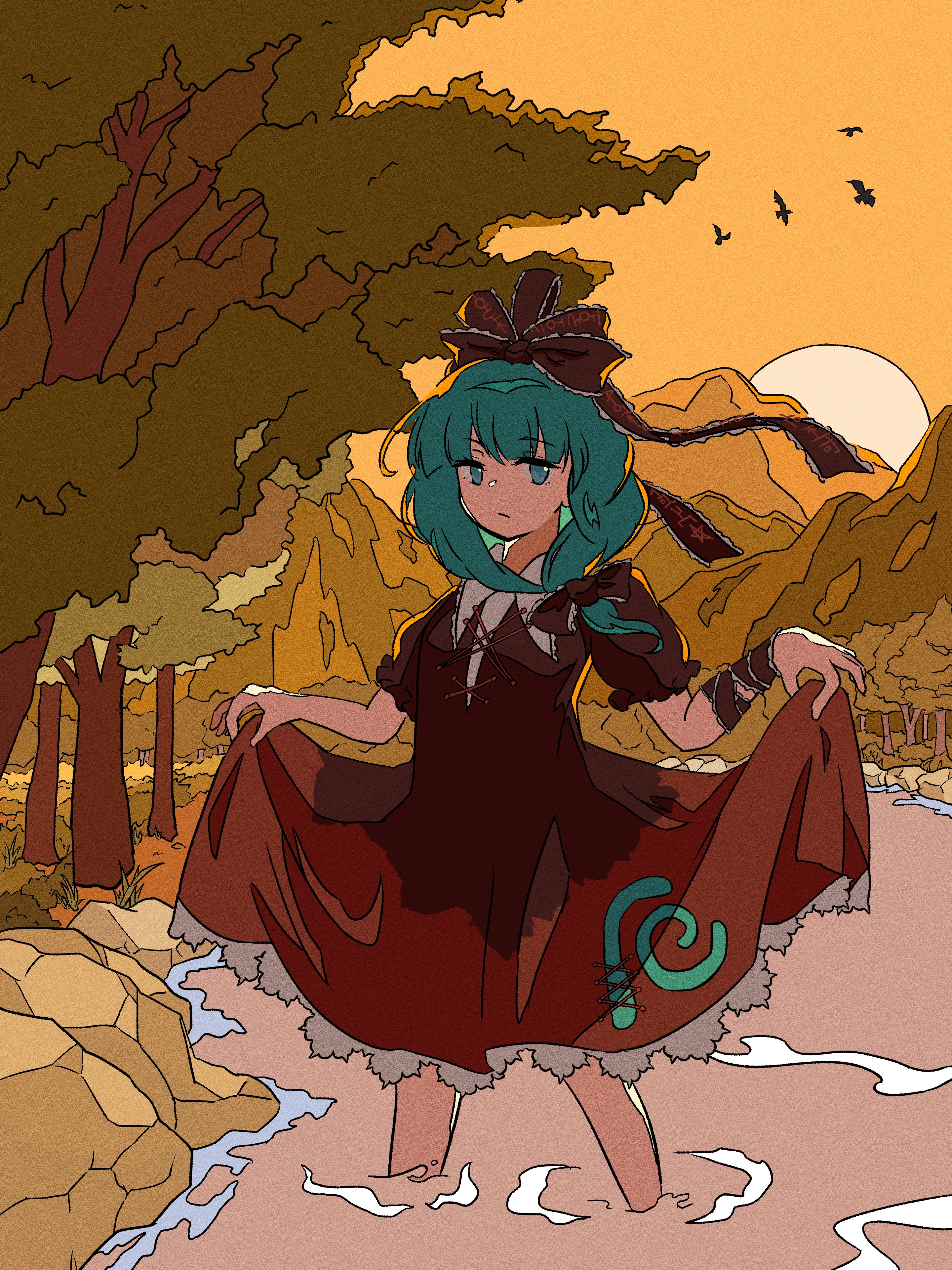 1girl absurdres bow clothes_lift dress dress_lift frilled_dress frills green_eyes green_hair highres kagiyama_hina kaisouou_konbu looking_at_viewer outdoors red_bow red_dress red_ribbon ribbon river solo touhou water