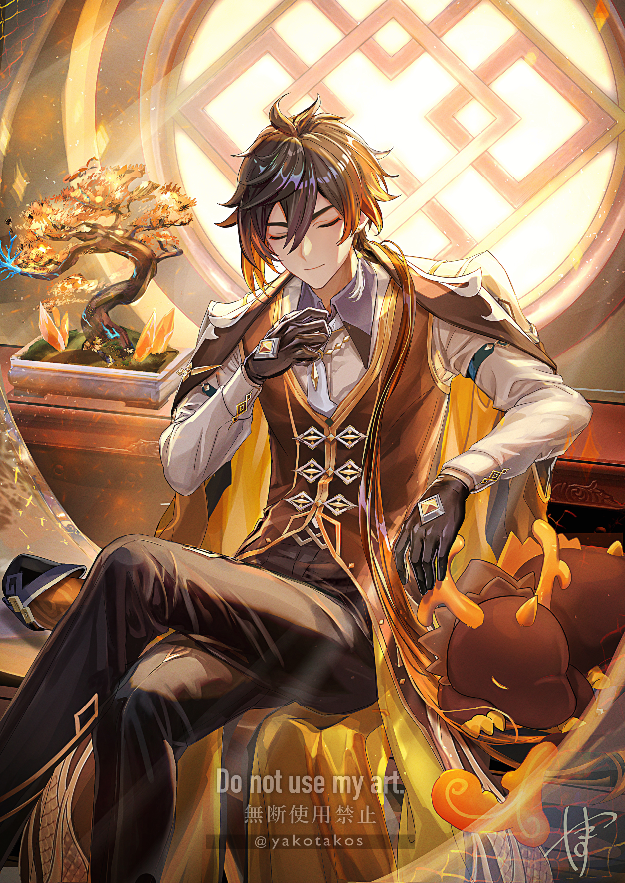 1boy adjusting_clothes adjusting_necktie antenna_hair aratakosu_(tako's) artist_name black_gloves black_pants bonsai brown_coat brown_hair brown_shirt brown_vest buttons closed_eyes closed_mouth coat coat_on_shoulders collared_shirt commentary_request crossed_legs earrings eyeliner gem genshin_impact gloves gradient_hair hair_between_eyes hair_over_shoulder hand_up highres indoors jewelry lapels light_particles light_rays long_hair long_sleeves low_ponytail makeup male_focus multicolored_hair necktie pants ponytail red_eyeliner rex_lapis_(genshin_impact) round_window shirt single_earring sitting smile solo table tassel tassel_earrings twitter_username u_u very_long_hair vest watermark white_necktie window wing_collar yellow_gem zhongli_(genshin_impact)
