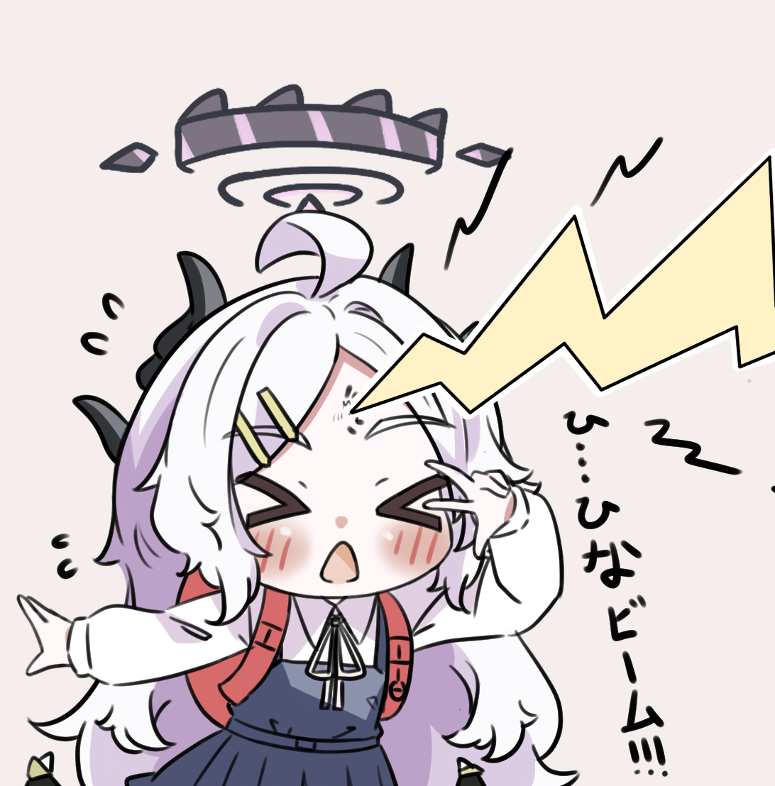 >_< 1girl backpack bag black_horns blue_archive blue_dress blush demon_girl demon_horns dress e_v_e_neko forehead grey_background hair_ornament hairclip halo hina_(blue_archive) horns lightning long_hair long_sleeves open_mouth parted_bangs pinafore_dress purple_halo randoseru red_bag shirt shukusei!!_loli-kami_requiem simple_background sleeveless sleeveless_dress wavy_hair white_hair white_shirt