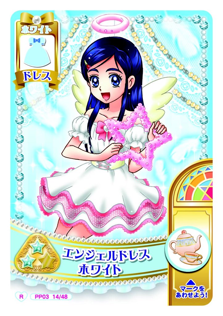 1girl angel angel_wings artist_request bare_arms blue_background border bow bowtie brooch card_(medium) commentary_request corset cowboy_shot cross-laced_clothes cross-laced_corset cup dress eyelashes fake_halo fake_wings feathers forehead frilled_dress frilled_sleeves frills futari_wa_precure hair_ornament hairclip halo happy heart heart_brooch heart_hair_ornament holding holding_star invisible_chair jewelry light_blush long_hair looking_at_viewer off-shoulder_dress off_shoulder official_alternate_costume official_art open_mouth pink_bow pink_bowtie pink_halo pointy_nose precure puffy_short_sleeves puffy_sleeves purple_eyes purple_hair saucer second-party_source short_dress short_sleeves sidelocks sitting smile solo star_(symbol) straight_hair tea teacup teapot thick_eyebrows traditional_halo translation_request white_border white_corset white_dress white_wings wings yukishiro_honoka