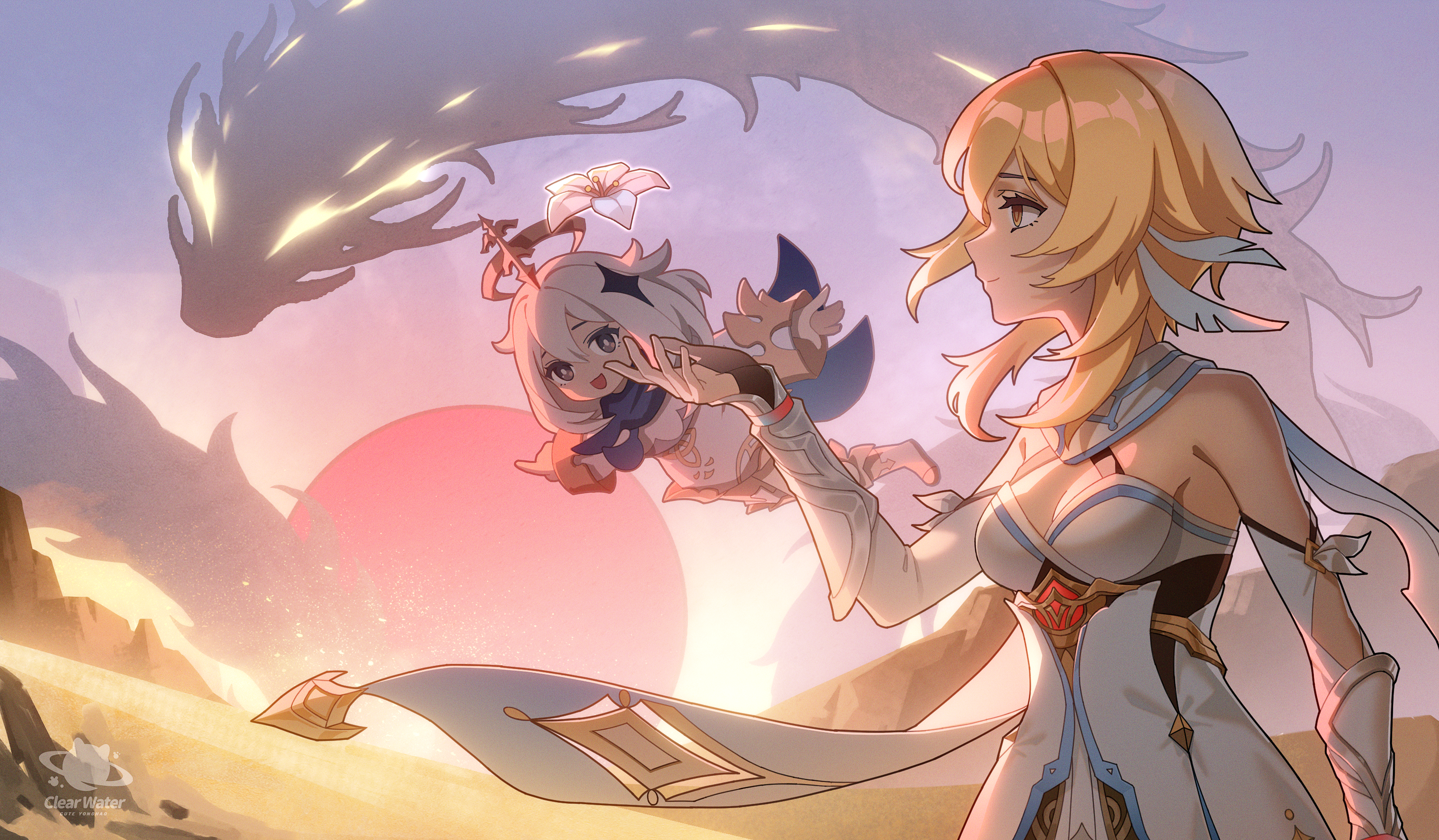 2girls apep_(genshin_impact) blonde_hair clear_water desert dress eyed_silhouette feather_hair_ornament feathers floating flower genshin_impact hair_ornament halo highres lumine_(genshin_impact) multiple_girls paimon_(genshin_impact) romper scarf silhouette white_dress white_flower white_hair white_romper white_scarf