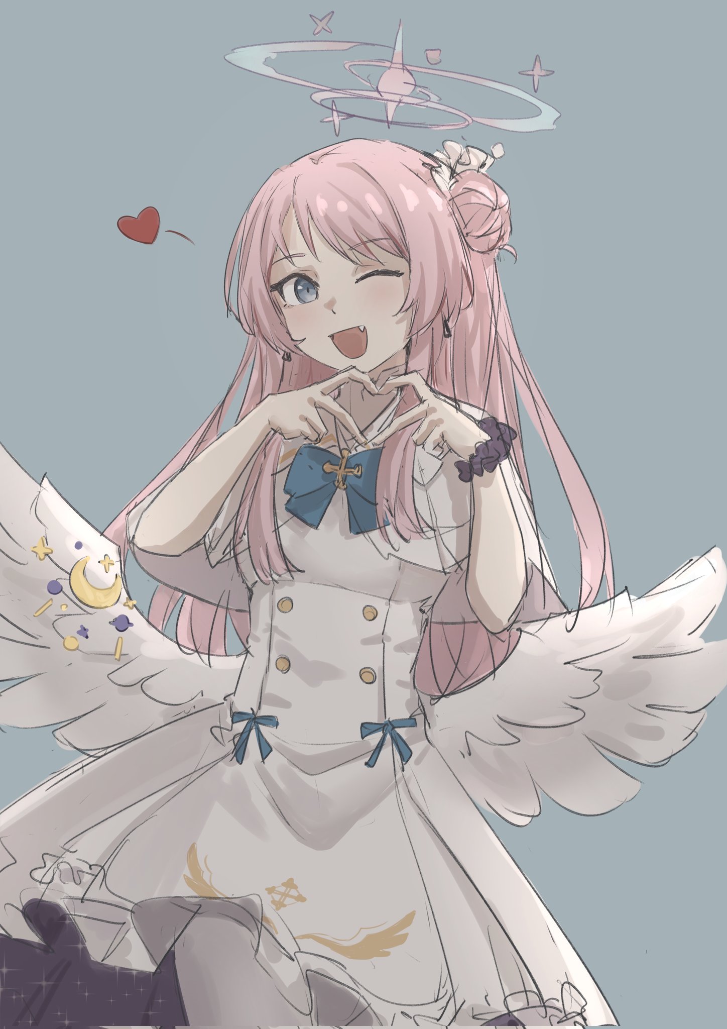 1girl :d alternate_hairstyle bang_dream! bang_dream!_it's_mygo!!!!! black_scrunchie blue_archive blue_bow blue_bowtie blue_eyes blue_halo blue_ribbon bow bowtie buttons capelet chihaya_anon commentary_request corrupted_twitter_file cosplay cowboy_shot crescent crescent_ornament dazhong_(dazhong02312) dress dress_ribbon earrings fang feathered_wings four-finger_heart_hands gradient_halo grey_background hair_bun hair_ornament hair_scrunchie halo hands_up heart heart_hands highres jewelry leaning_to_the_side long_hair looking_at_viewer low_wings mika_(blue_archive) mika_(blue_archive)_(cosplay) moon_(ornament) multicolored_halo one_eye_closed open_mouth pantyhose pink_hair pink_halo print_dress ribbon scrunchie simple_background sketch smile solo sparkle star_ornament swept_bangs two-tone_halo very_long_hair white_capelet white_dress white_pantyhose white_scrunchie wing_ornament wings wrist_scrunchie