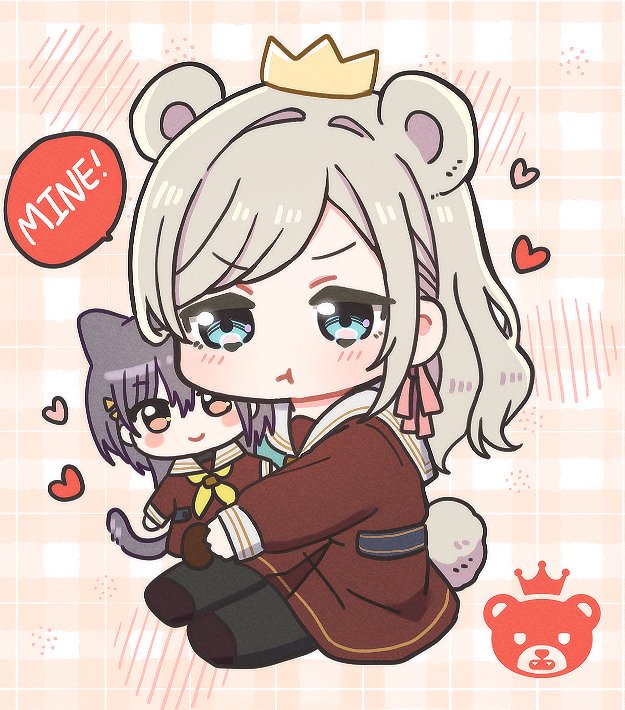 1girl :t animal_ears aqua_neckerchief bear_ears bear_tail black_pantyhose blue_eyes blush brown_dress cat_ears cat_tail ceras_yanagida_lilienfeld character_doll character_logo chibi chibi_only closed_mouth colored_speech_bubble commentary_request crown doll dress edel_note english_text full_body gold_crown grey_hair hair_intakes hair_ribbon hasu_no_sora_school_uniform heart jealous katsuragi_izumi link!_like!_love_live! long_hair long_sleeves love_live! neckerchief orange_eyes pantyhose pink_ribbon plaid_background pout ribbon sailor_collar school_uniform sitting solo speech_bubble tail v-shaped_eyebrows virtual_youtuber white_sailor_collar winter_uniform yoon_(yoon_lovelive)