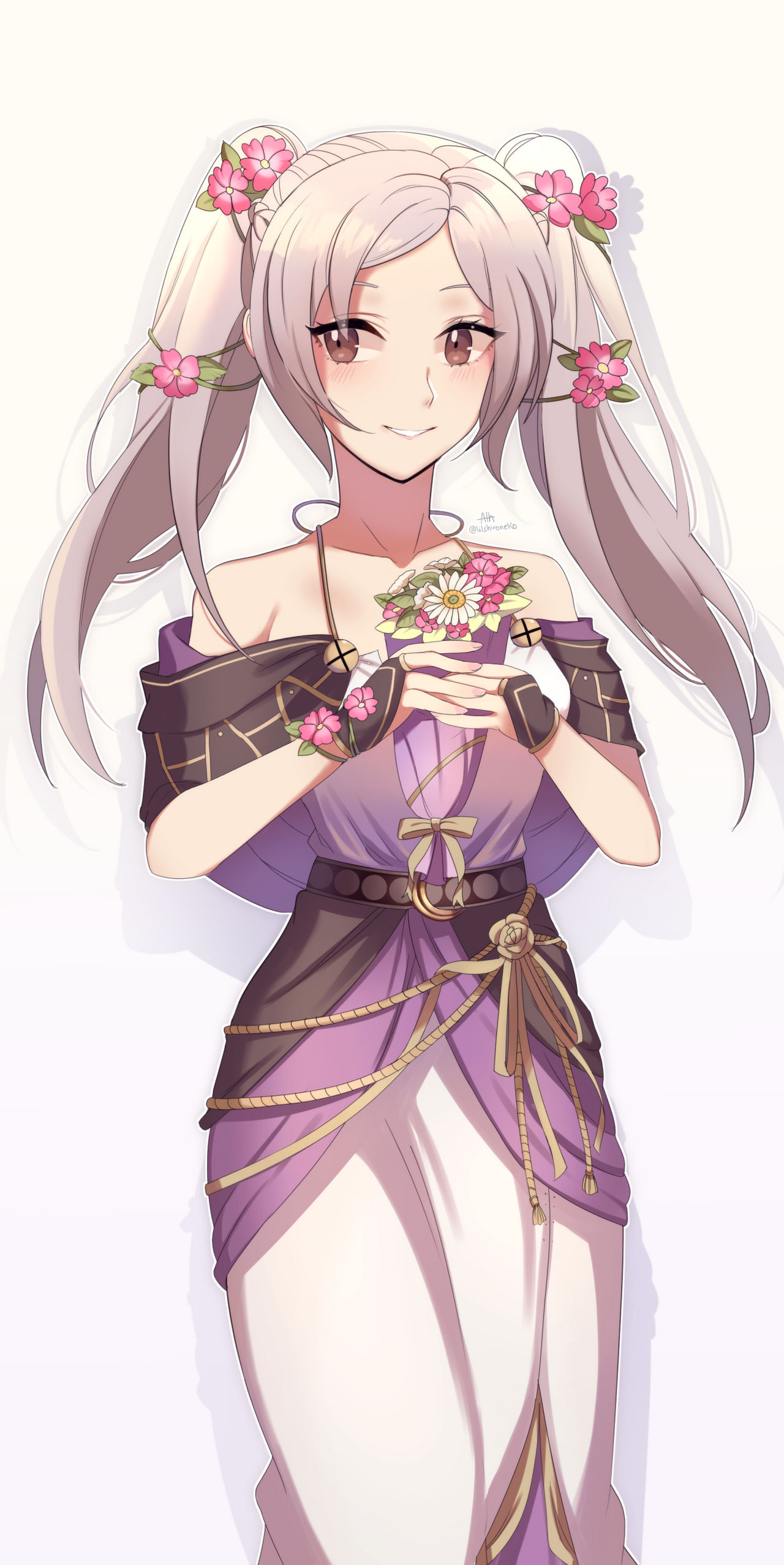 1girl absurdres armpit_crease bare_arms bare_shoulders bouquet breasts brown_eyes capelet cleavage dress eyelashes female_focus female_robin_(fire_emblem) female_robin_(valentine)_(fire_emblem) fingerless_gloves fingernails fire_emblem fire_emblem_awakening fire_emblem_heroes flower gloves gradient_background hair_flower hair_ornament halterneck hands_up happy highres holding holding_bouquet light_blush lilshironeko long_dress long_hair looking_to_the_side medium_breasts mermaid_dress neck nintendo official_alternate_costume parted_lips rope_belt sidelocks sideways_glance signature sleeveless sleeveless_dress smile spaghetti_strap standing swept_bangs tight_clothes tight_dress twintails white_hair