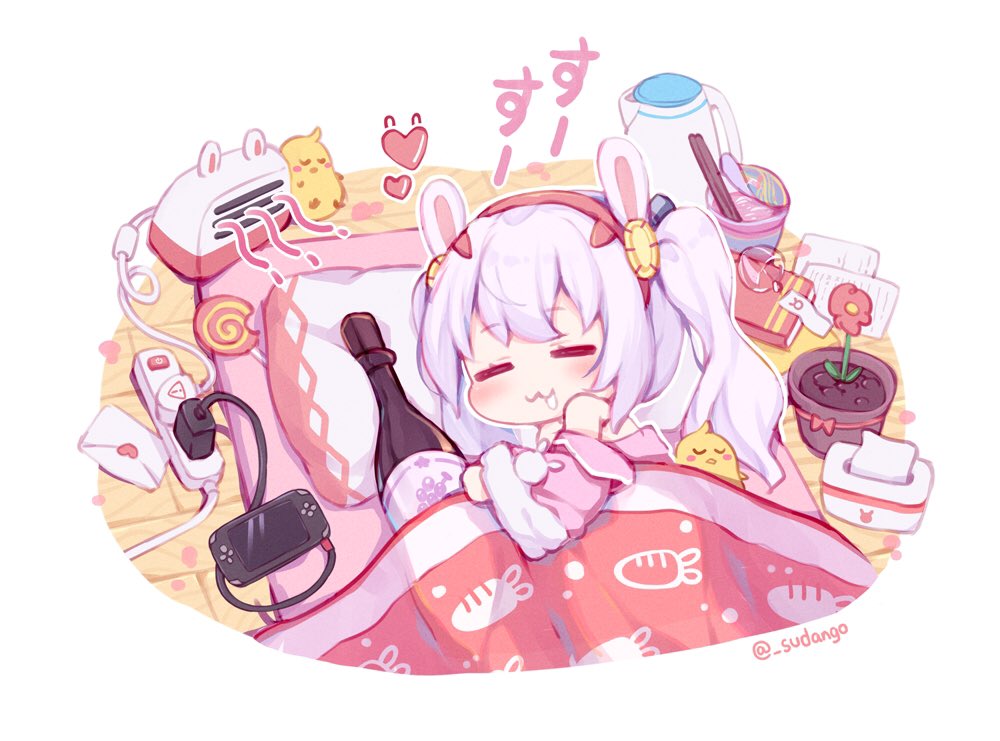 1girl :3 animal_ears artist_name azur_lane bottle chibi chibi_only chopsticks closed_eyes closed_mouth commentary_request instant_cup_noodles drooling fake_animal_ears flower_pot fur-trimmed_sleeves fur_trim hairband handheld_game_console head_on_pillow instant_cup_noodles instant_noodles jacket kettle laffey_(azur_lane) long_hair long_sleeves lying manjuu_(azur_lane) on_side pillow pink_jacket rabbit_ears red_hairband sleeping sudango tissue_box twintails under_covers white_hair