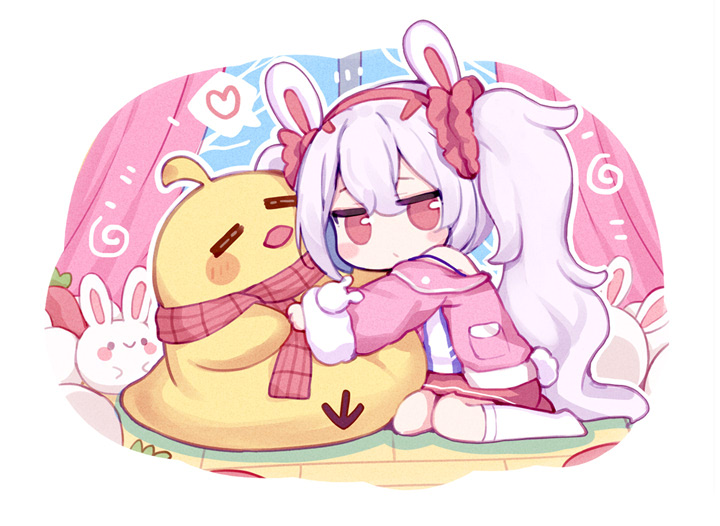 1girl :/ animal animal_ears animal_hug azur_lane baby_animal bird blush_stickers camisole chibi chibi_only chick closed_mouth commentary_request fake_animal_ears fake_tail full_body fur-trimmed_sleeves fur_trim hair_ornament hair_scrunchie hairband heart jacket jitome laffey_(azur_lane) long_hair long_sleeves looking_at_viewer manjuu_(azur_lane) no_shoes open_clothes open_jacket oversized_animal pink_jacket rabbit_ears rabbit_tail red_eyes red_hairband red_scrunchie red_skirt scrunchie sitting skirt speech_bubble spoken_heart strap_slip sudango tail thighhighs twintails very_long_hair white_camisole white_hair white_thighhighs