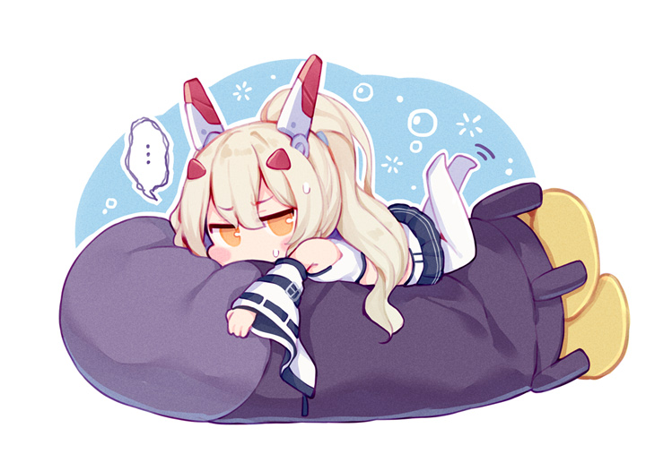 ... 1girl ayanami_(azur_lane) ayanami_(retrofit)_(azur_lane) azur_lane blonde_hair blue_skirt blush_stickers chibi chibi_only commentary_request crop_top detached_sleeves full_body furrowed_brow headgear jitome legs_up long_hair long_sleeves looking_at_viewer lying midriff motion_lines no_shoes on_stomach orange_eyes pantyhose ponytail shirt skirt sleeveless sleeveless_shirt solo speech_bubble spoken_ellipsis sudango sweat white_pantyhose white_shirt white_sleeves wide_sleeves