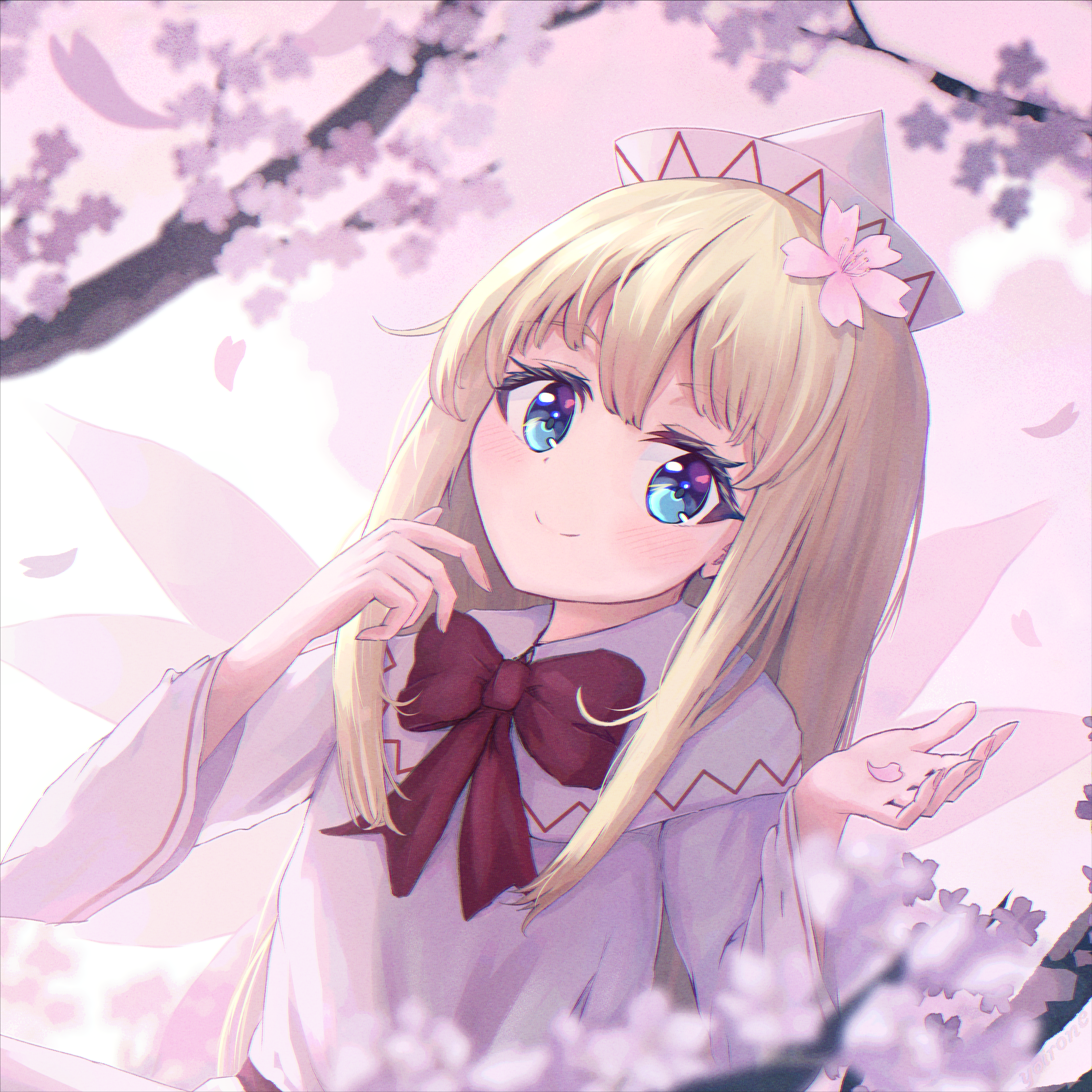 1girl absurdres blonde_hair blue_eyes blurry blurry_foreground blush bow bowtie branch capelet cherry_blossoms closed_mouth commentary_request flower hair_flower hair_ornament hat highres lily_white long_hair long_sleeves looking_at_viewer pink_flower pink_wings red_bow red_bowtie smile solo touhou upper_body white_capelet white_hat wings yoirone