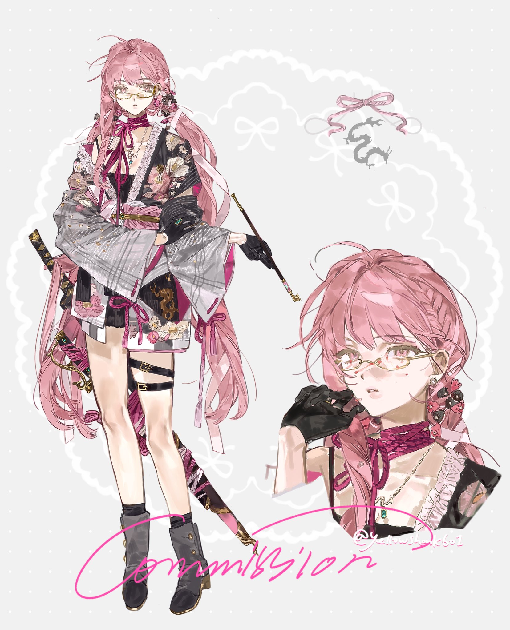 1girl black_boots boots braid commission english_text full_body glasses highres katana long_hair multiple_views original pink_hair solo sword twitter_username weapon white_background yellowshark601