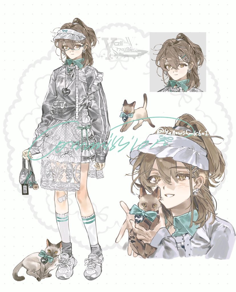 1girl animal aqua_bow bow brown_cat brown_hair cat commission english_text full_body grin holding holding_animal holding_cat multiple_views original smile solo teeth twitter_username upper_body white_background yellowshark601