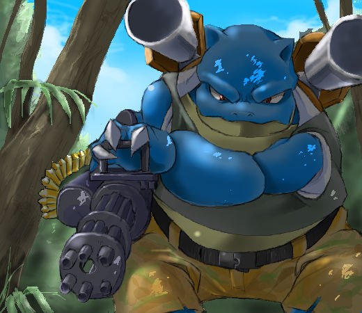 1boy aiming aiming_at_viewer belt black_belt blastoise blue_sky brown_eyes brown_pants cannon cargo_pants facing_to_the_side forest garou-zuki gatling_gun gen_1_pokemon grey_shirt gun holding holding_gun holding_weapon leaf leaning_forward looking_at_viewer male_focus minigun nature nintendo outdoors pants pokemon pokemon_(creature) shirt shoulder_cannon sky tree turtle_shell weapon